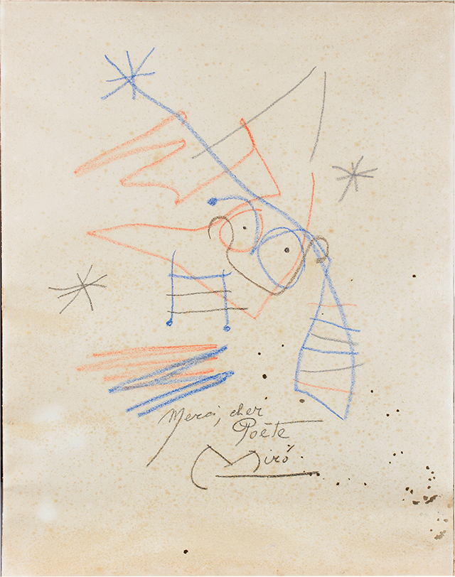JOAN MIRO’ Barcellona 1893 - Palma di Maiorca 1983 Segni, 1968 ca. Pastelli a cera, cm 64,5 x 50 Firma e dedica ‘Merci, cher poète’ in basso al centro Difetti alla carta A richiesta autentica su foto Archivio Mirò