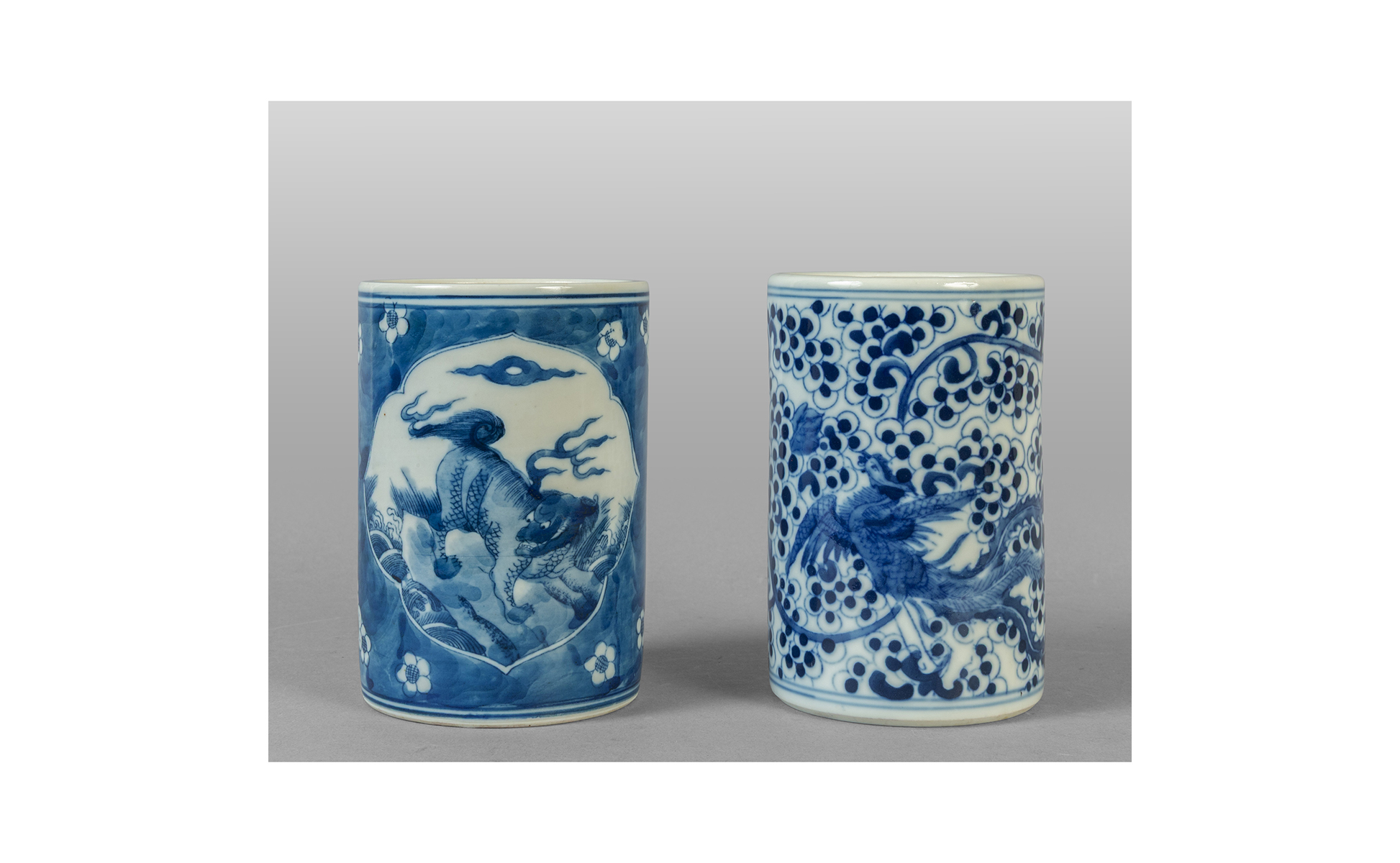 Due portapennelli in porcellana bianca e blu dinastia Qing
