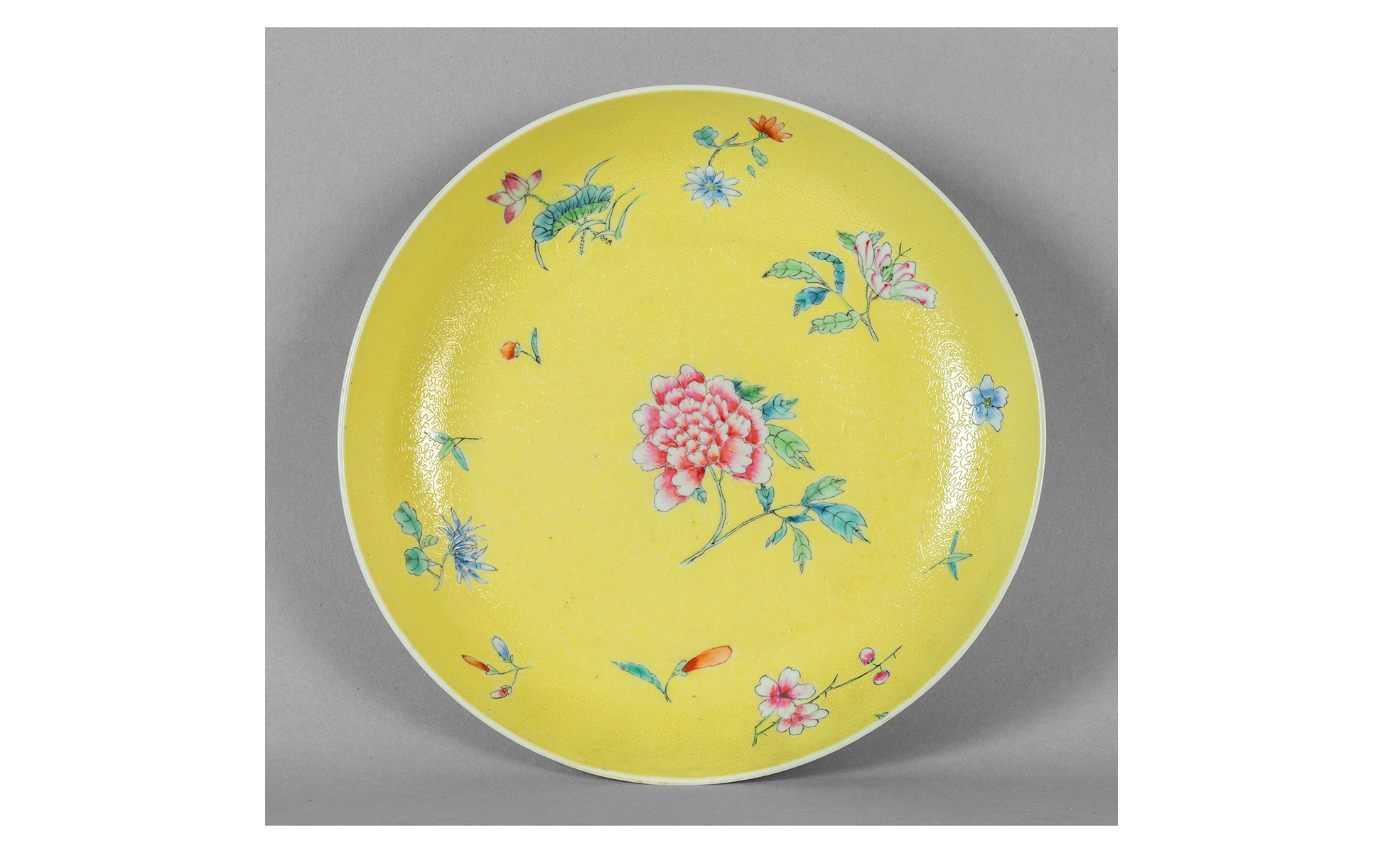 Piatto in porcellana famiglia Rosa a fondo giallo decorata a motivi floreali marcato alla base Cina sec.XIX
