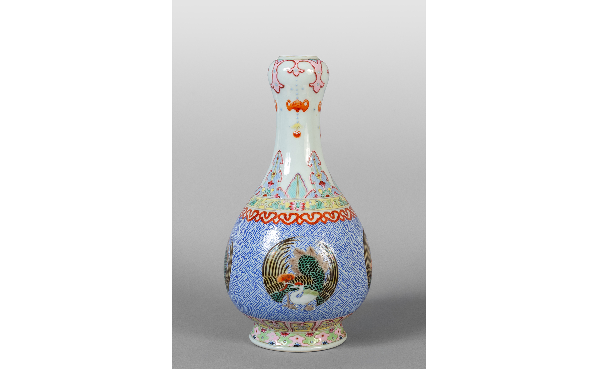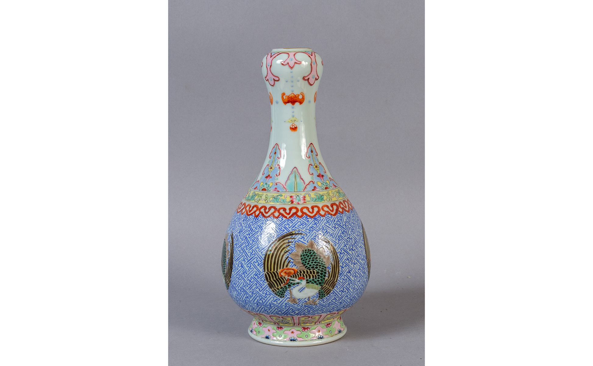 Vasetto in porcellana a fiasca decorato con fenici e fungo marcato alla base Cina metà sec.XX