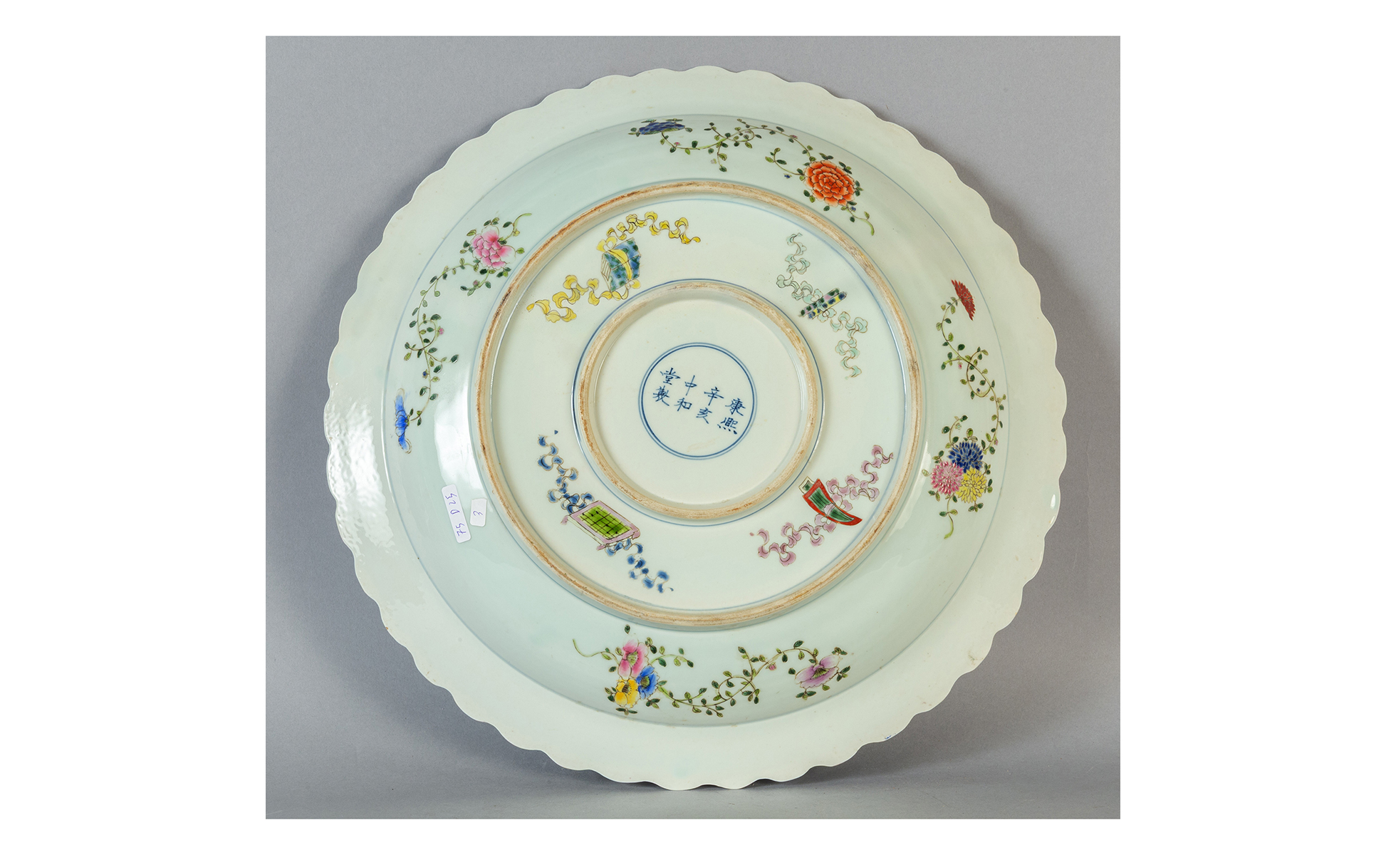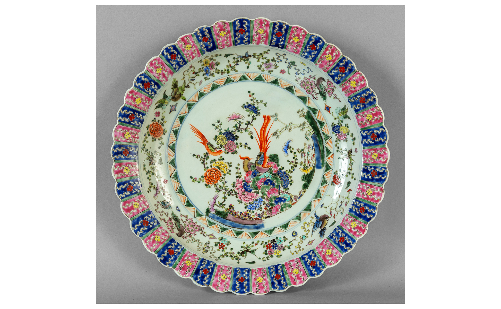 Grande piatto in porcellana con bordo mistilineo decoro a fiori e uccelli nel retro con simboli taoisti e firmato Cina I metà sec.XX