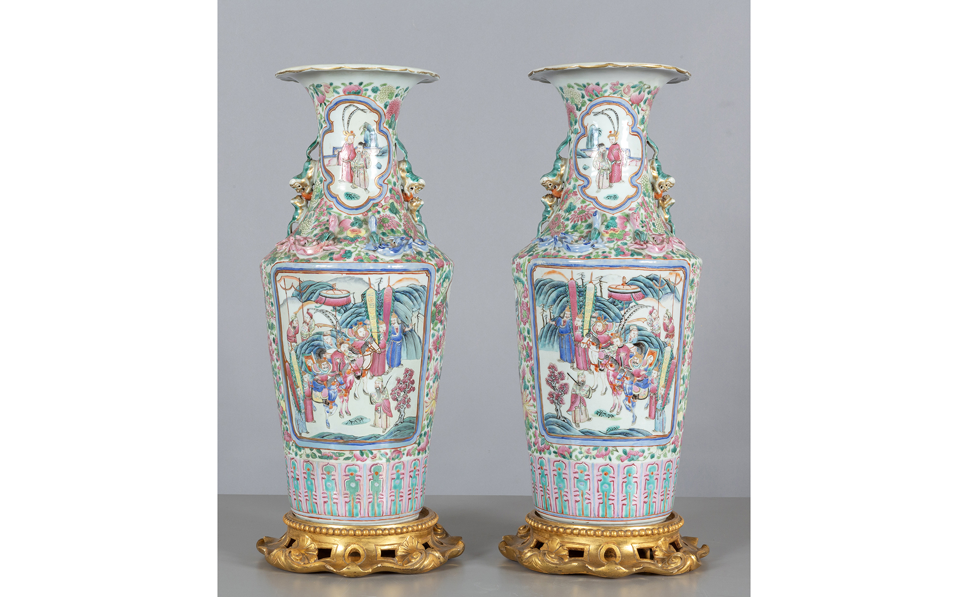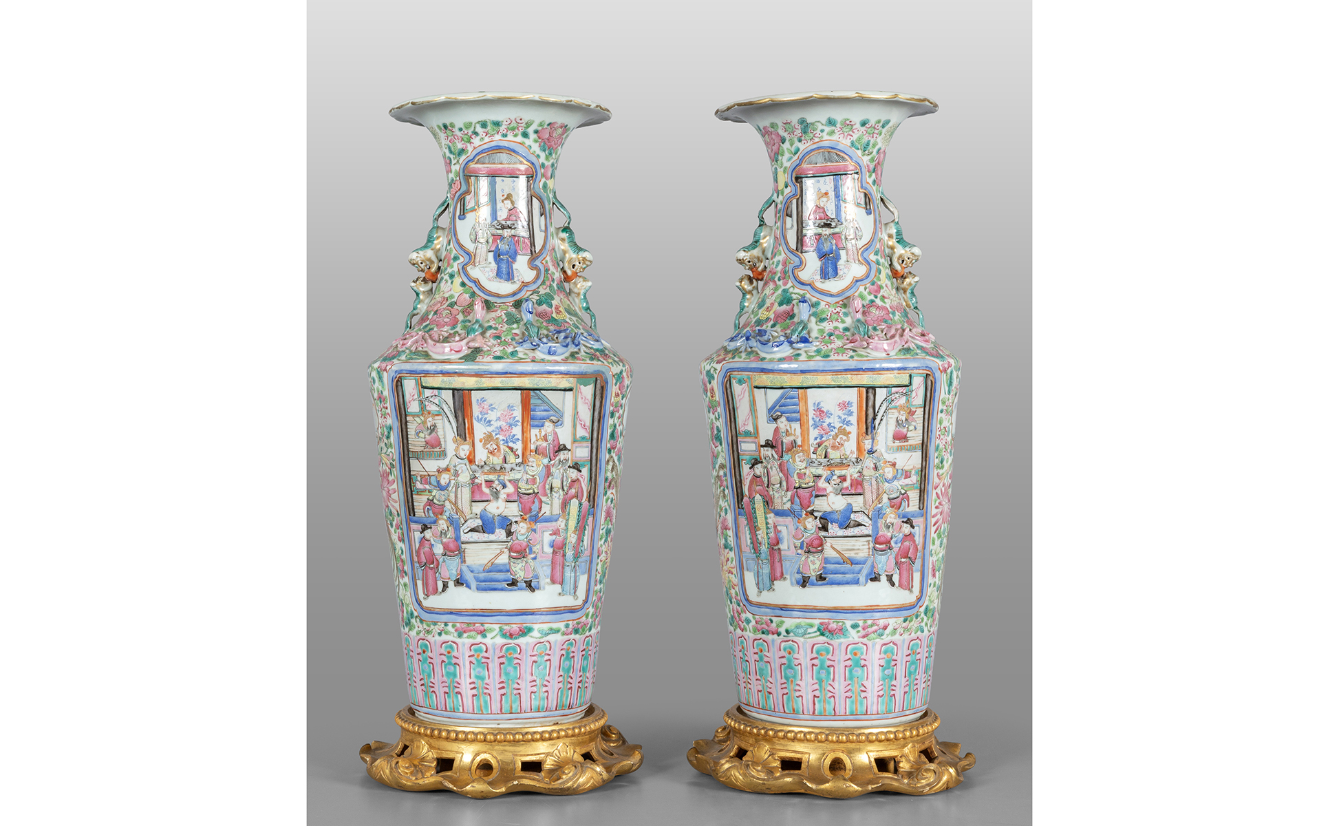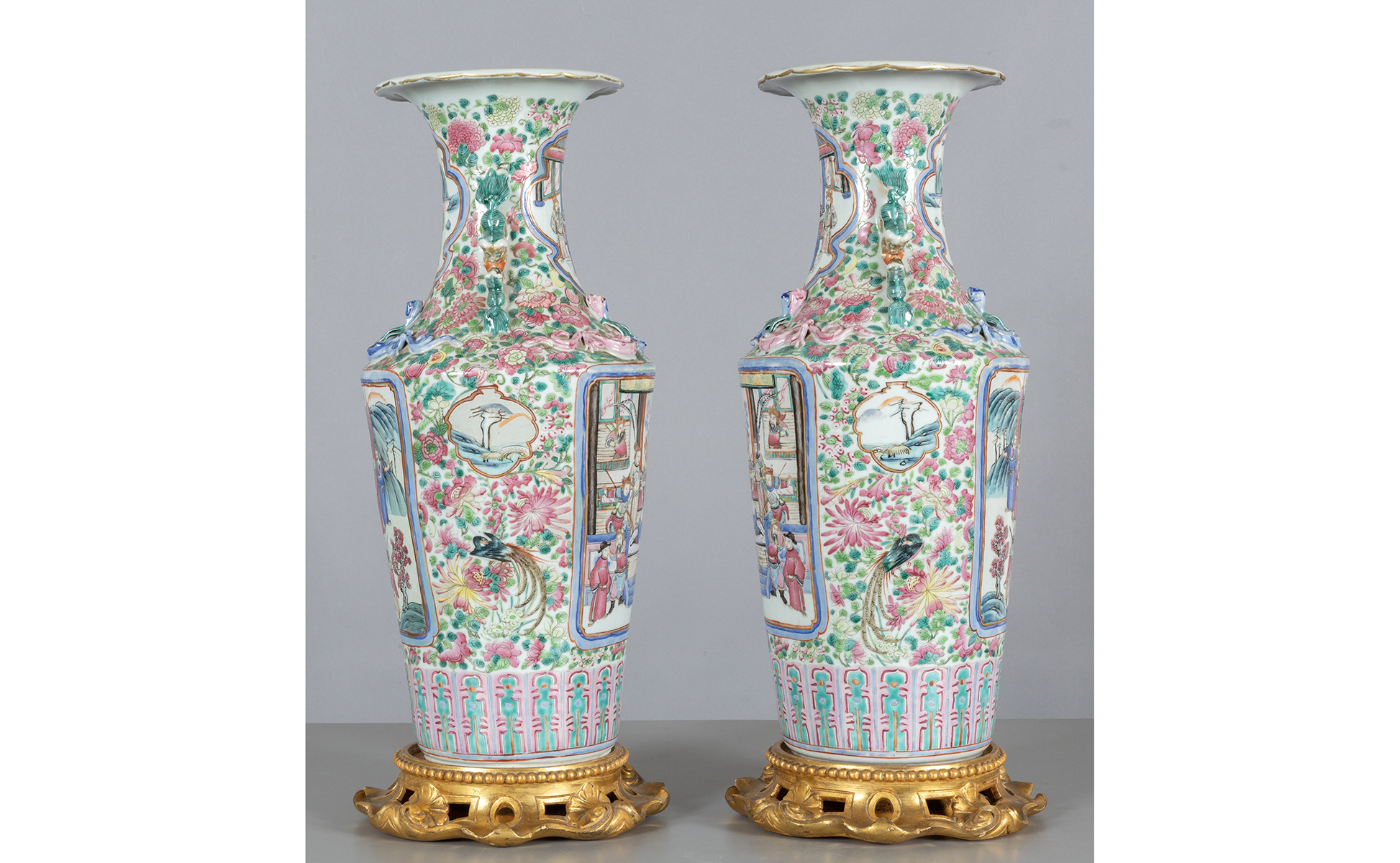 Coppia di vasi in porcellana famiglia rosa decorati a scena di vita cinese Cina sec.XIX poggianti su basi in legno finemente intagliato e dorato