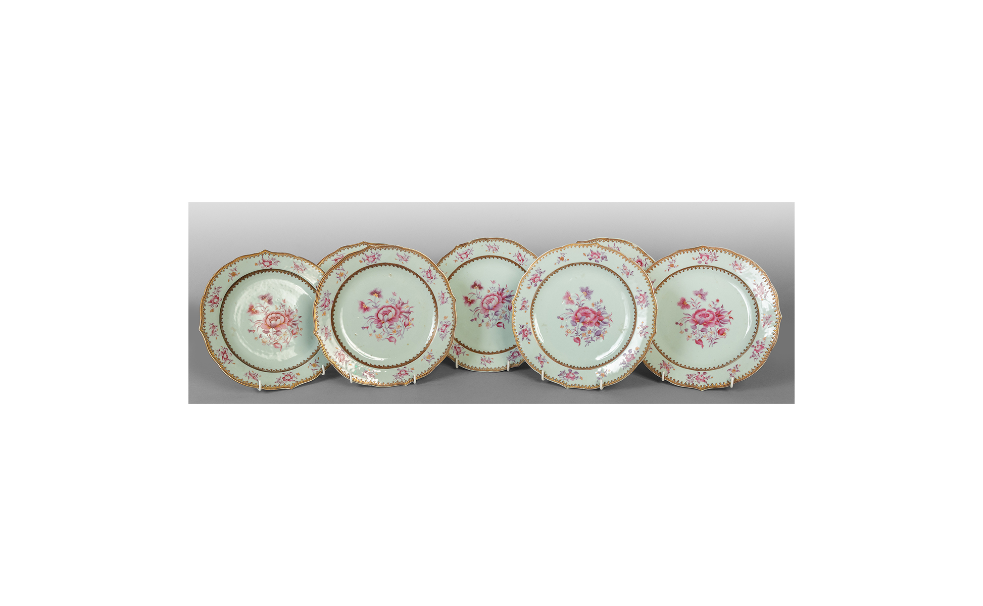 Sette piatti di forma polilobata in porcellana Compagnia delle Indie decorata in policromia con rosa centrale sec.XVIII