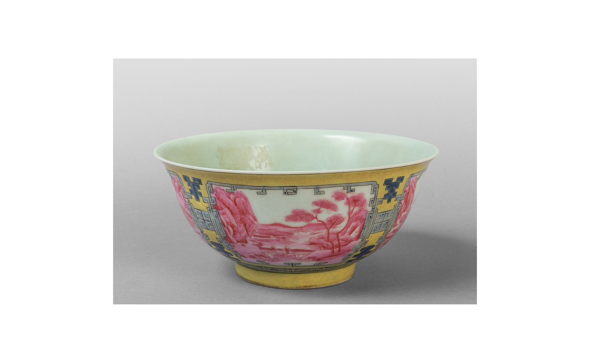 Coppa in porcellana a fondo giallo decorata a riserve con paesaggi in rosso marcata alla base Cina inizi sec.XX
