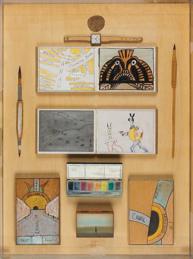 SAUL STEINBERG Ramnicu Sarat 1914 - New York 1999 Canal Street, 1990 Tecnica mista di oggetti scolpiti e pittura su tavolette applicate su tavola Misure cm 79 x 59 Sigla e data in basso al centro Teca in plexiglass Provenienza John Berggruen Gallery, San Francisco, USA Etichetta al retro The Pace Gallery, New York. Etichetta al retro e ivi acquistato dall’attuale proprietà nel 1996