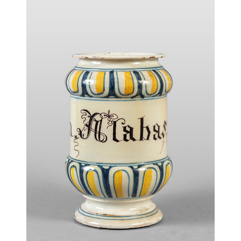 Albarello in ceramica decorato in policromia con scritta medicinale Bassano sec.XVIII