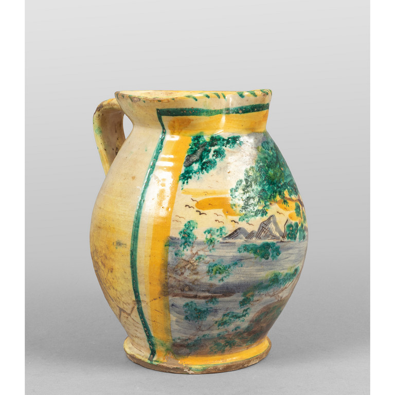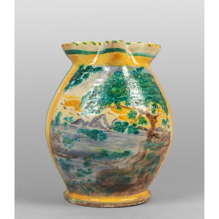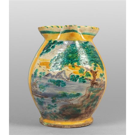 Versatoio in ceramica policroma decorato con paesaggio Italia Meridionale sec.XX