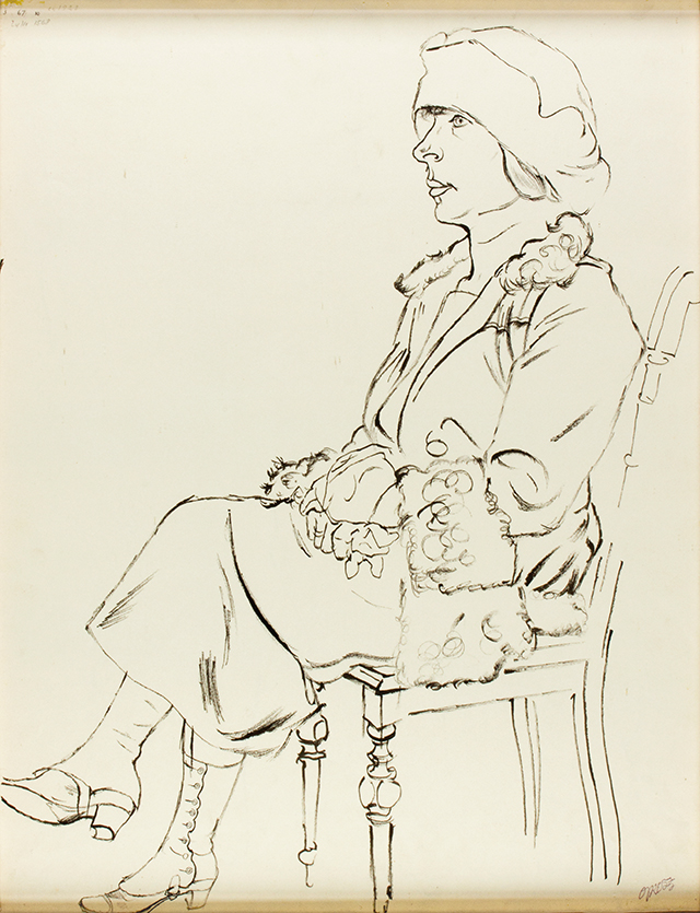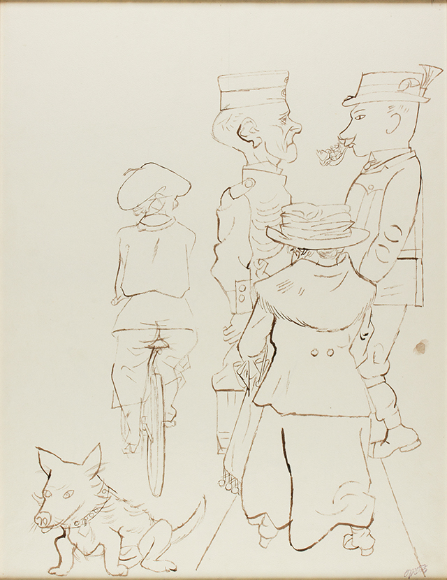 GEORGE GROSZ Berlino 1893 - 1959 Berlin street scene, 1923 ca. Inchiostro su carta double face, cm 62,6 x 48,7 Firma in basso a destra al fronte e al retro Al retro ritratto di donna con cappotto e cappello Autentica su foto Archivio George Grozs