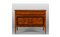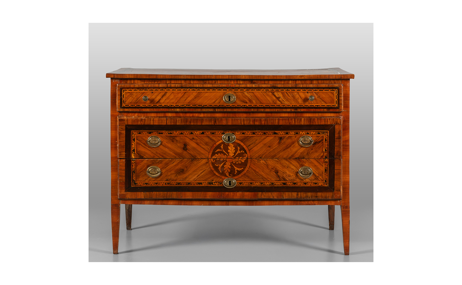 Comò Luigi XVI a tre cassetti lastronato in noce e radica di noce legni di frutto e palissandro Piacenza sec.XVIII