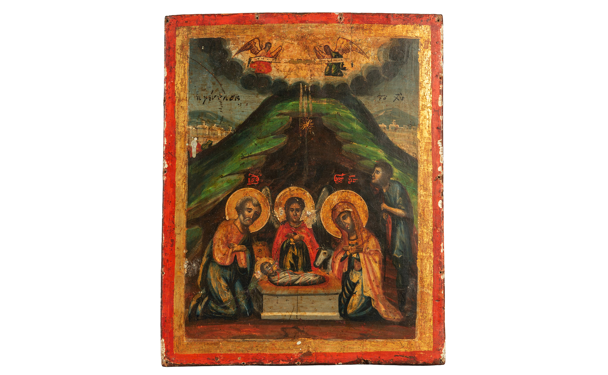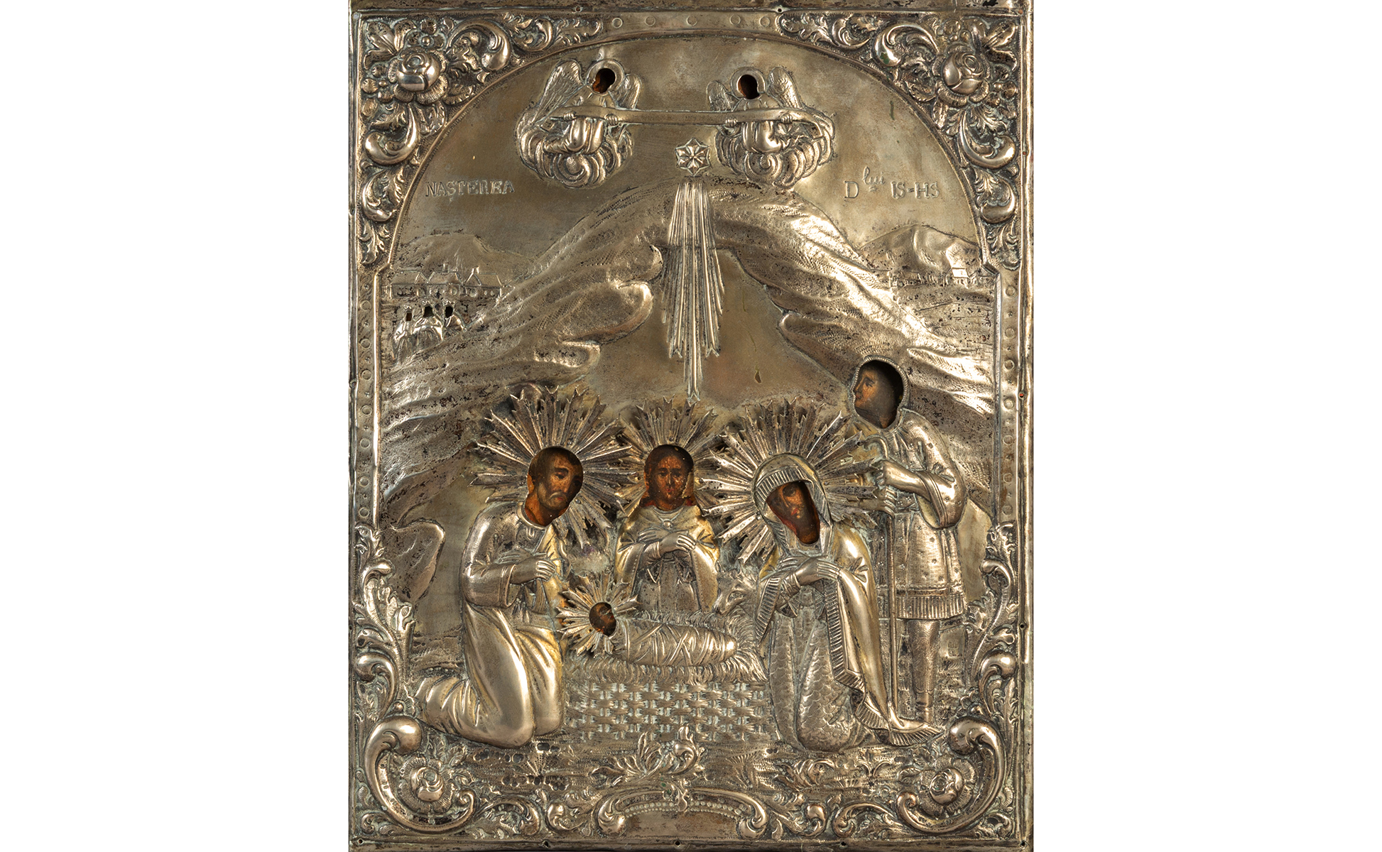 'Natività' icona tempera su tavola con riza in argento sbalzato Russia sec.XIX