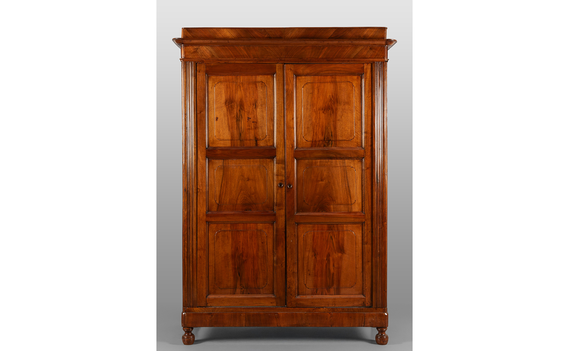 Armadio Carlo X a due ante in noce pannelli e fianchi intagliati a motivi geometrici sec.XIX