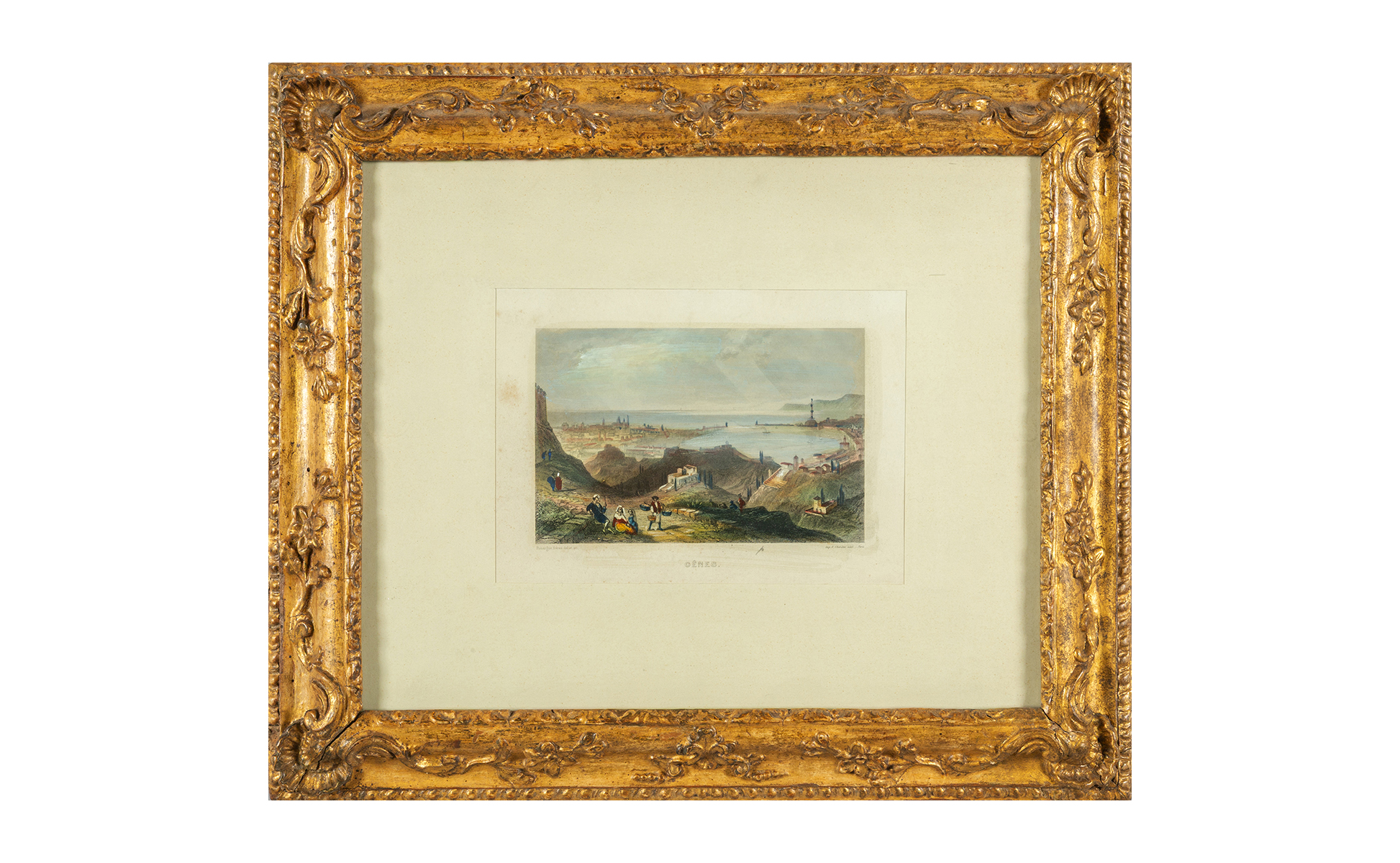 'Veduta di Genova' stampa acquarellata bella cornice in legno intagliato e dorato sec.XIX