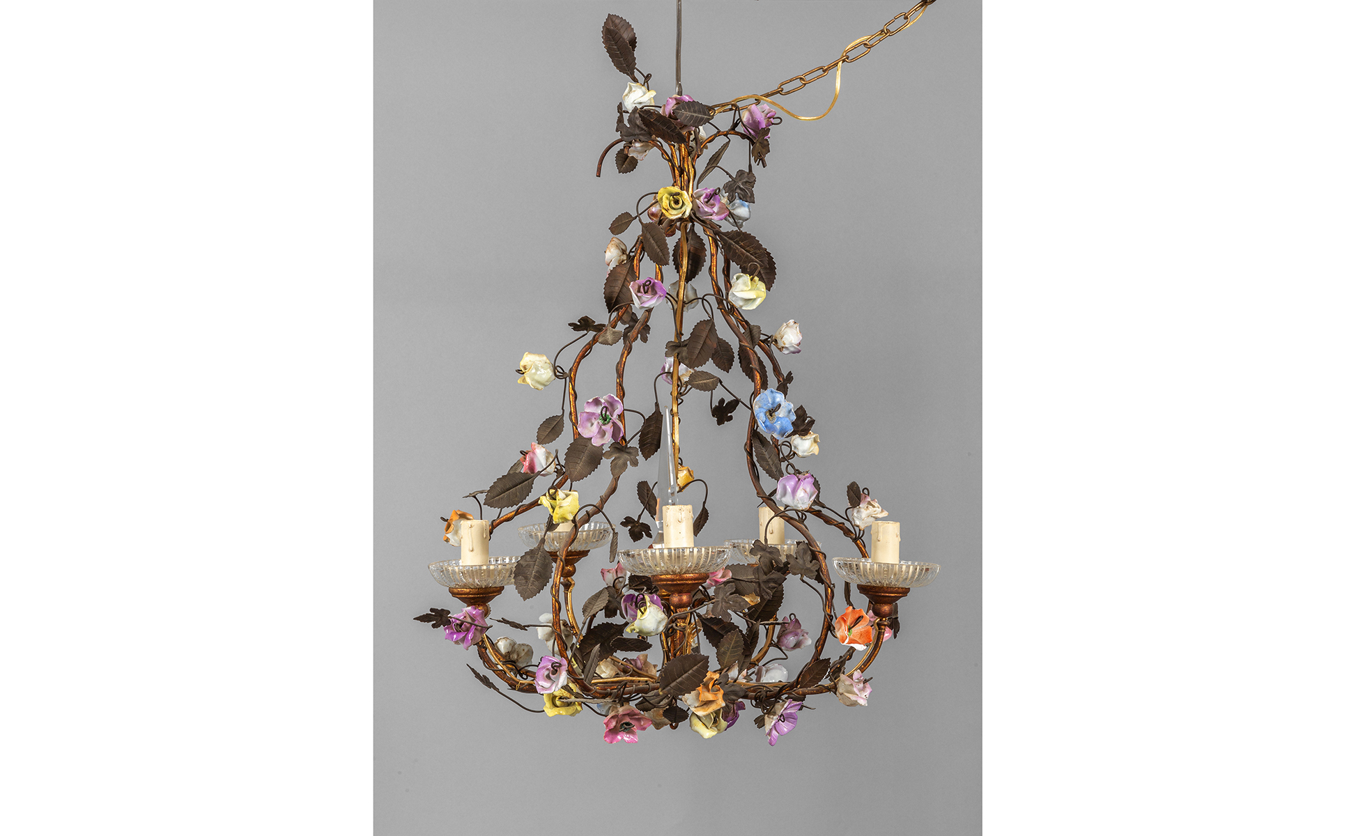 Lampadario a cinque luci in metallo con fiori in porcellana policroma