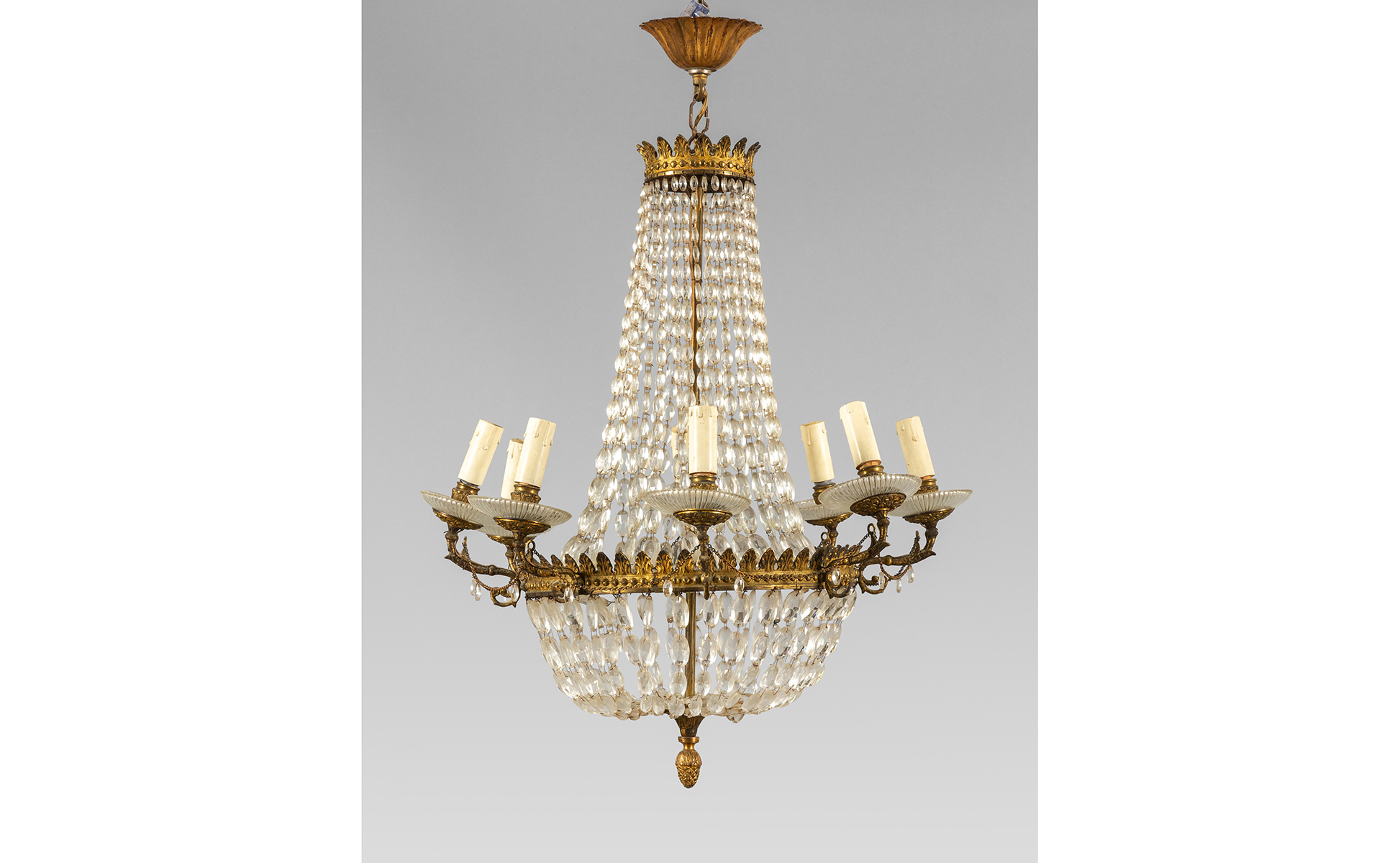 Lampadario Impero a cestino a sei luci in bronzo dorato e cristalli molati I metà sec.XIX