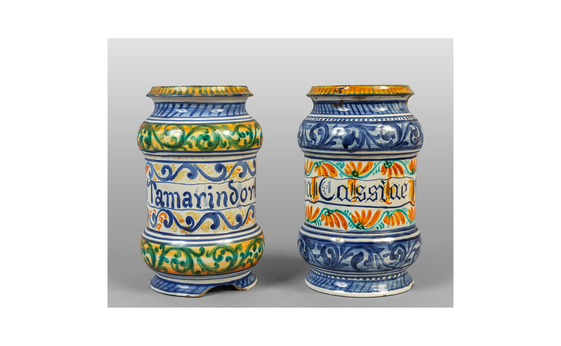 Coppia di albarelli in ceramica decorati in policromia con scritte medicinali sec.XX
