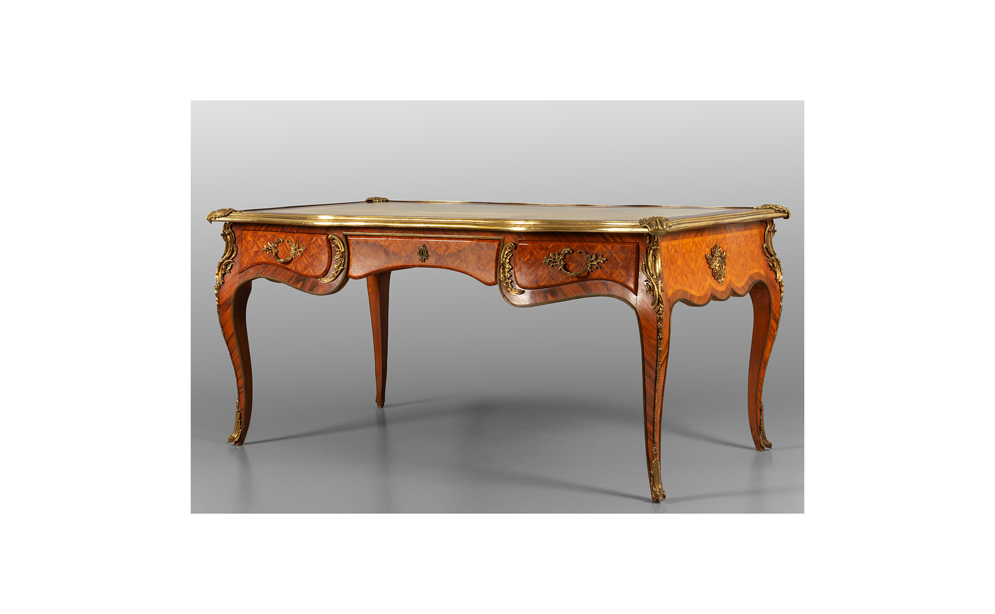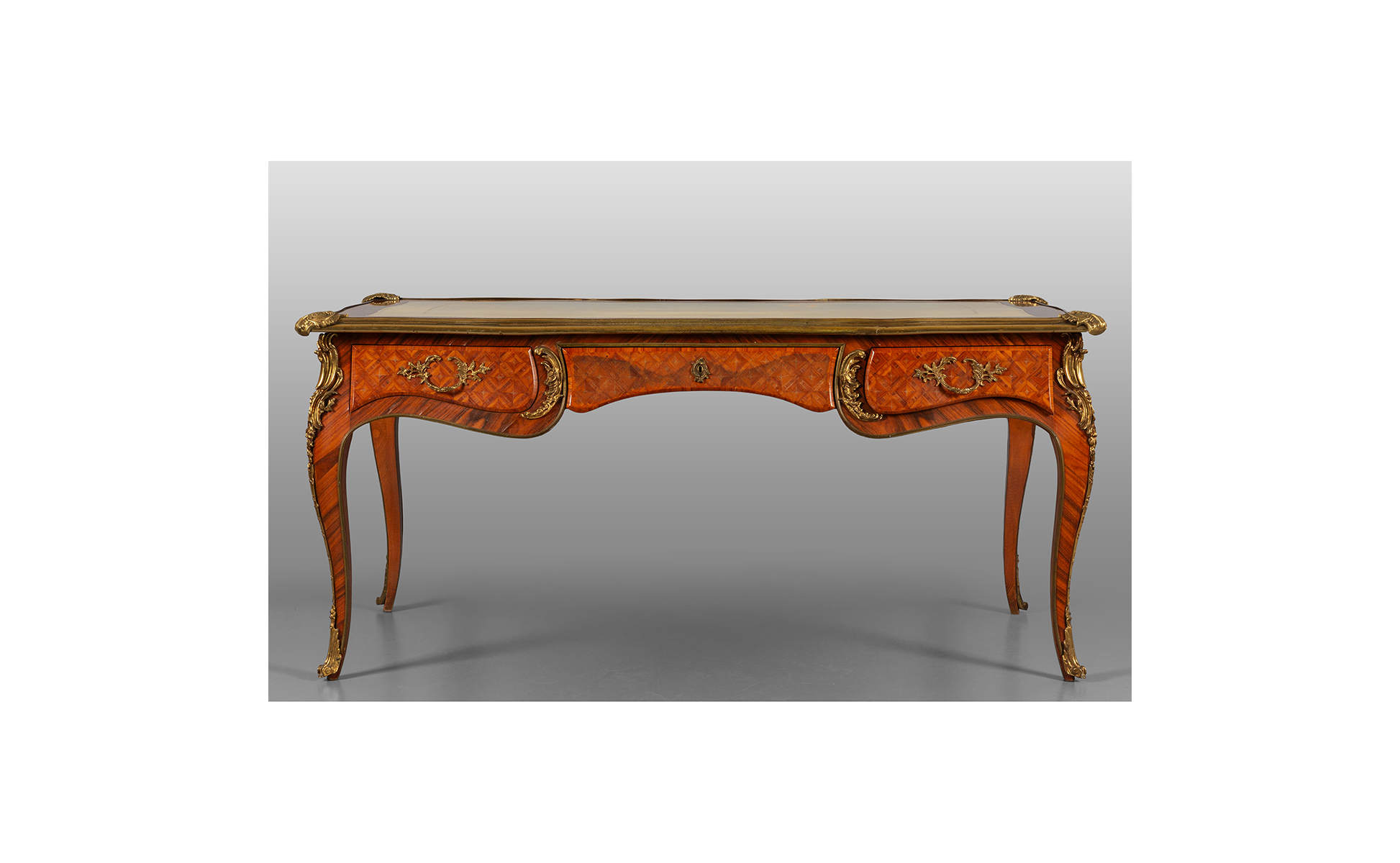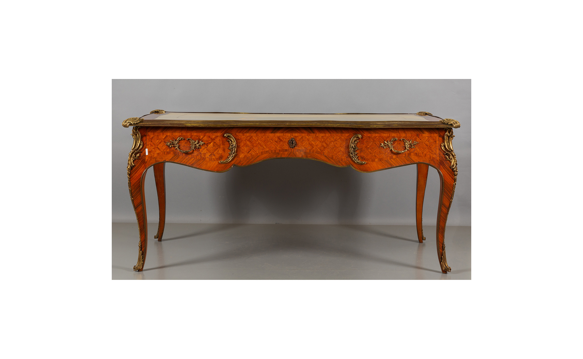 Grande diplomatica in stile Luigi XV lastronata in palissandro e finemente intarsiata in legni vari tre cassetti sul fronte ricca decorazione in bronzo dorato Francia sec.XX