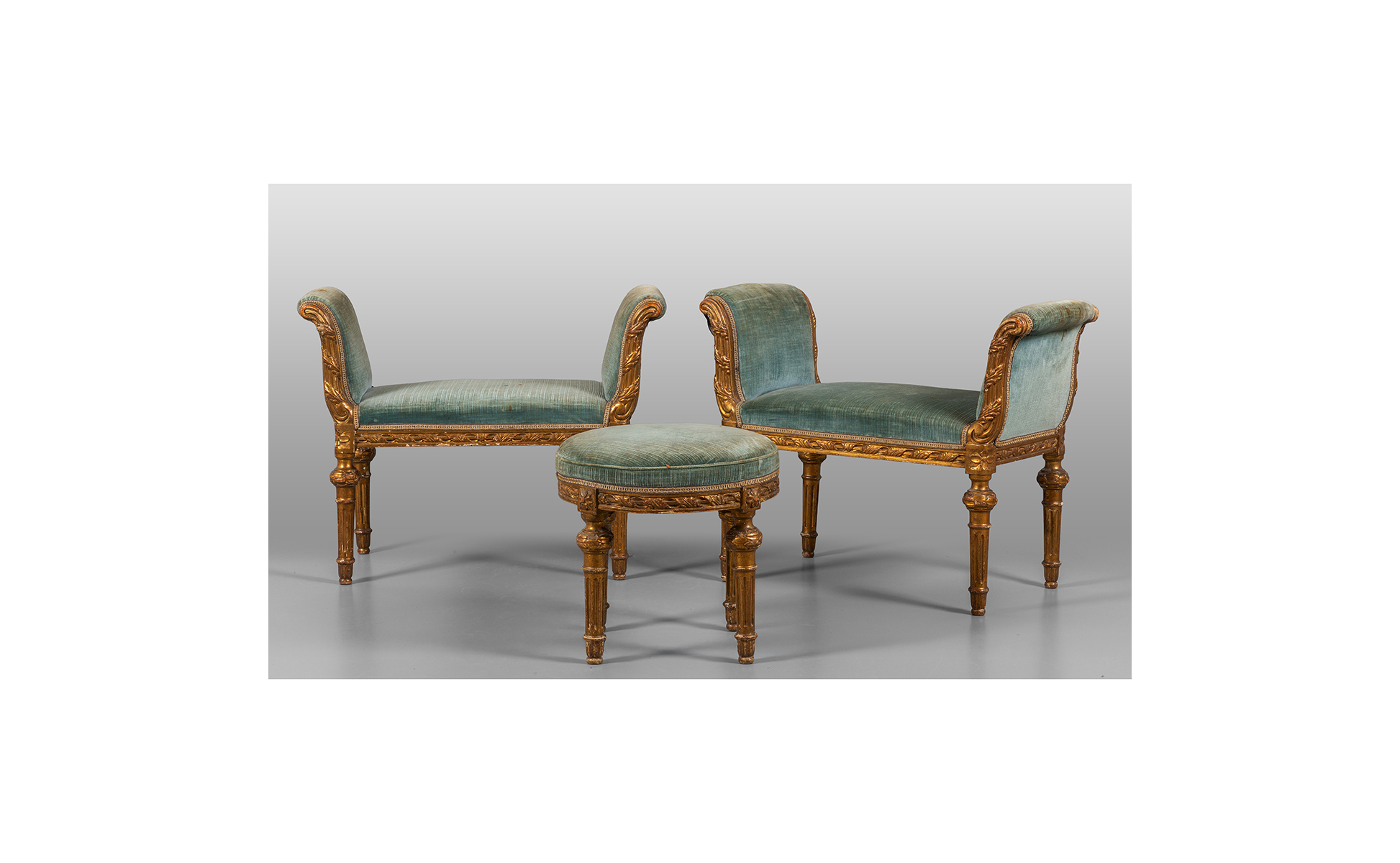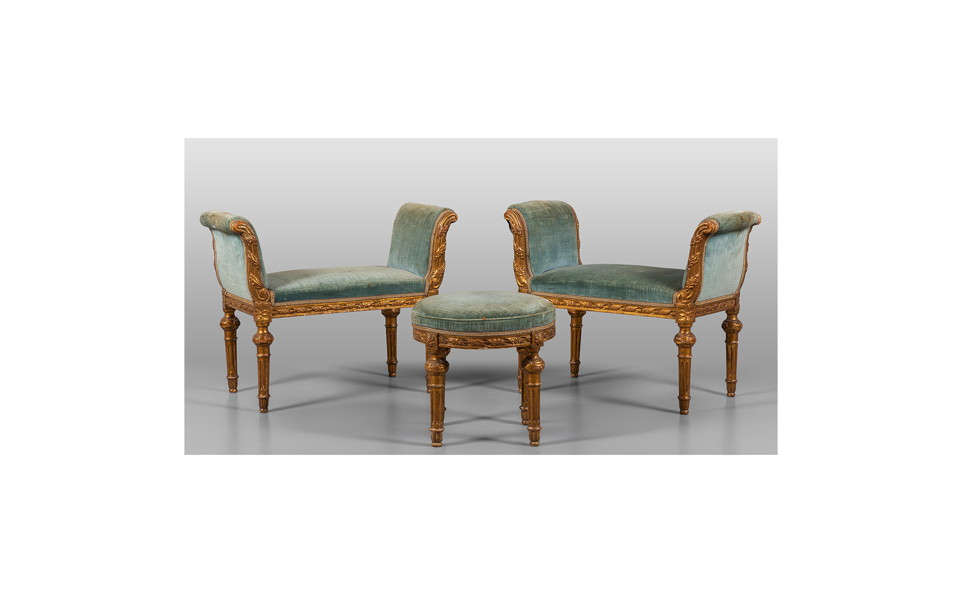 Coppia di panchette in stile Luigi XVI da centro in legno intagliato e dorato ed uno sgabello analogo sec. XIX