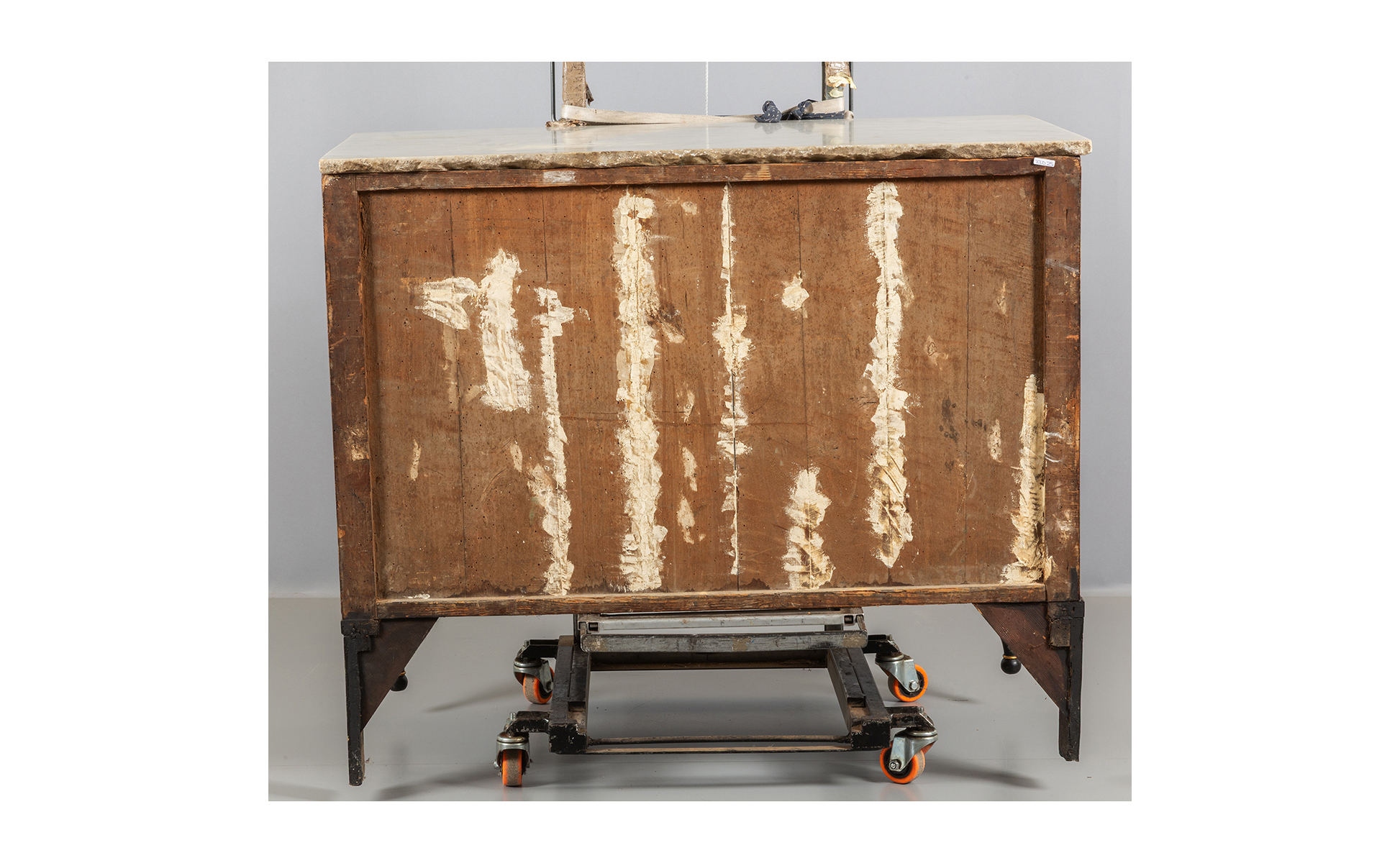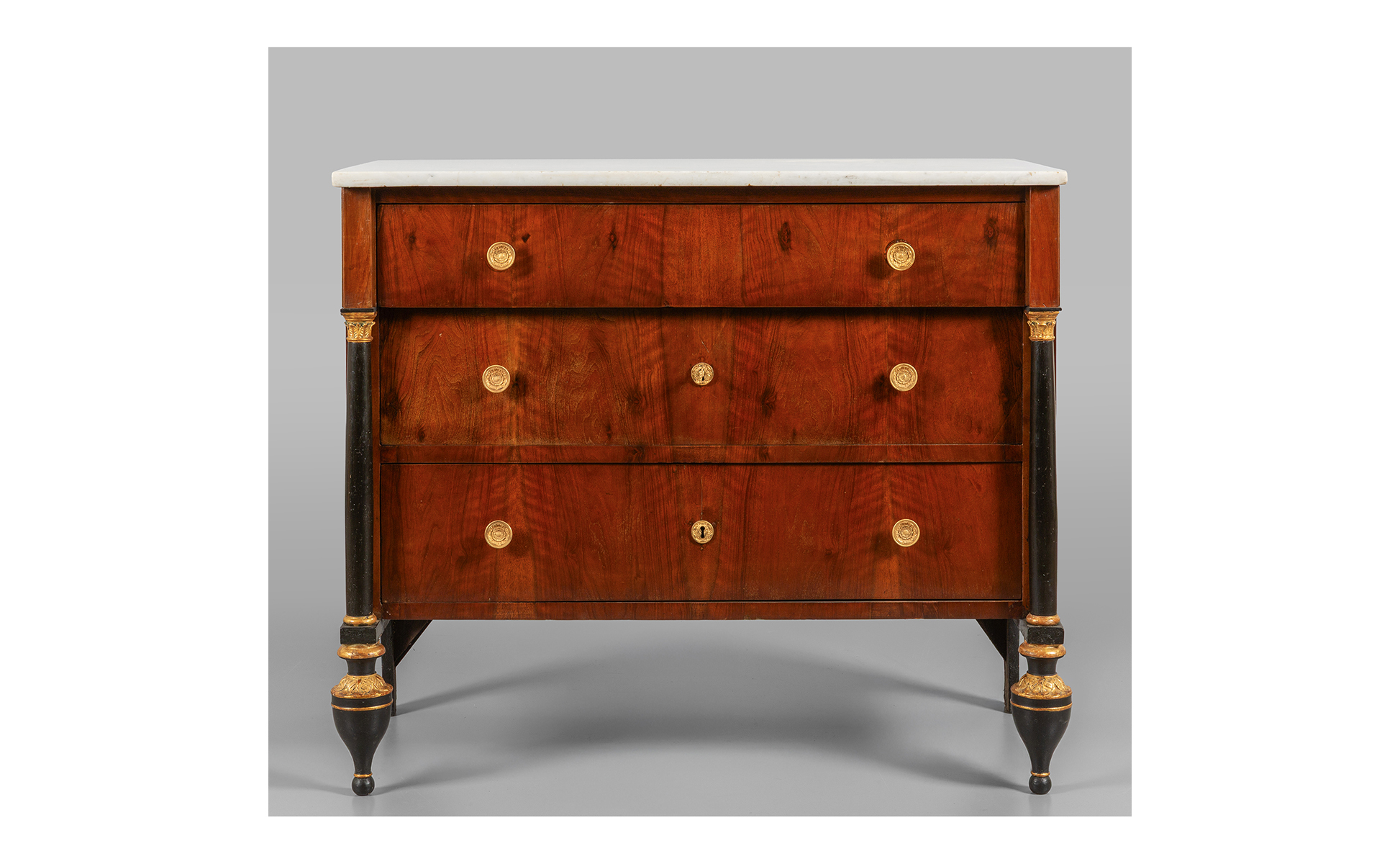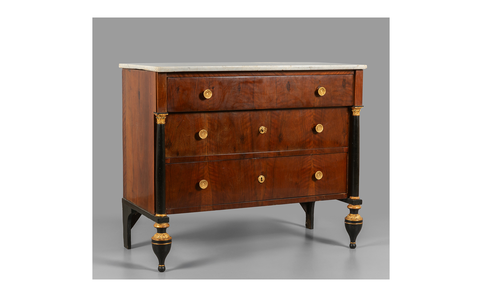 Comò Impero a tre cassetti lastronato in ciliegio colonne in legno ebanizzato con capitelli dorati Toscana inizi sec. XIX
