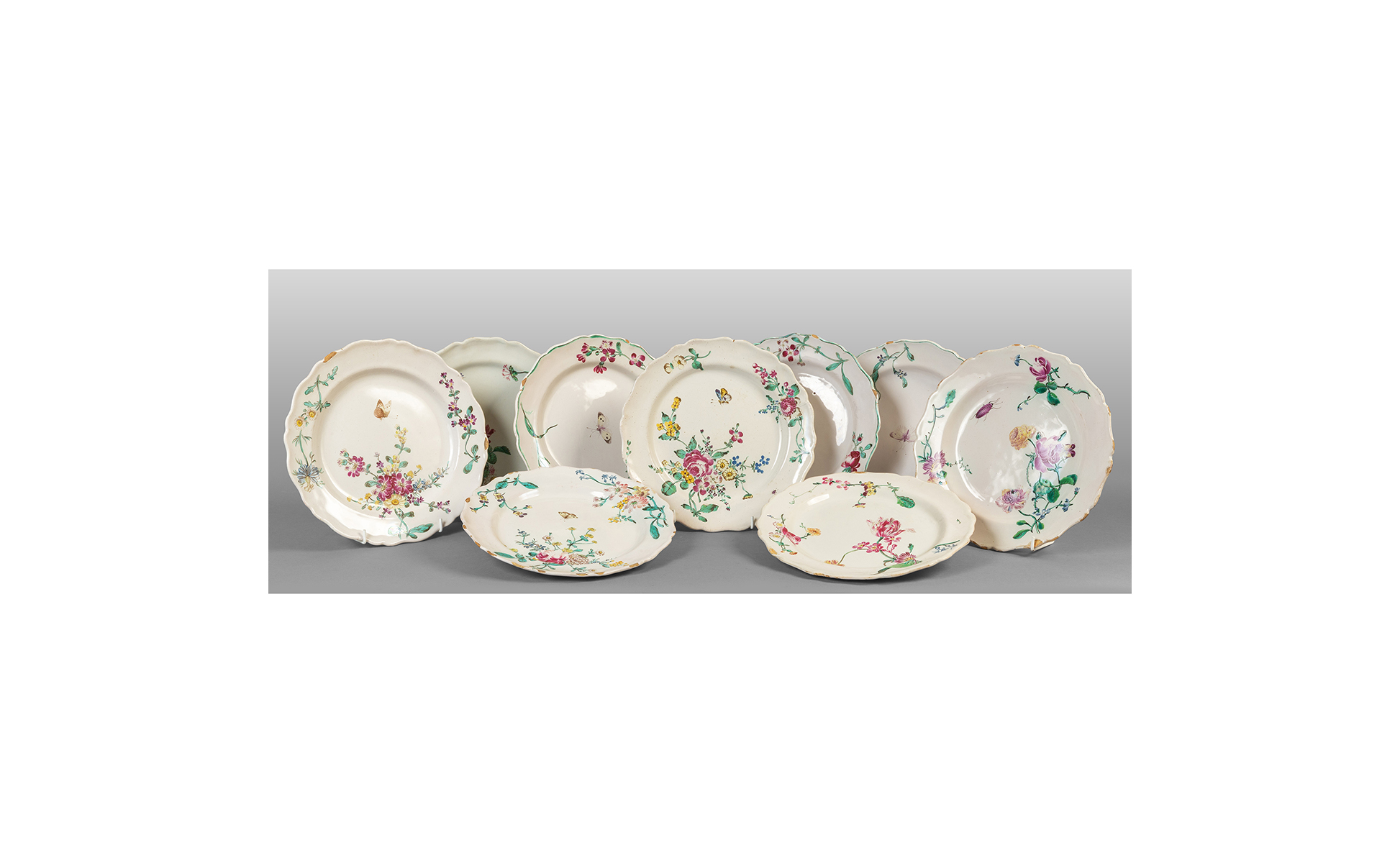 Nove piatti in ceramica decorati in policromia su fondo bianco Marsiglia sec.XVIII