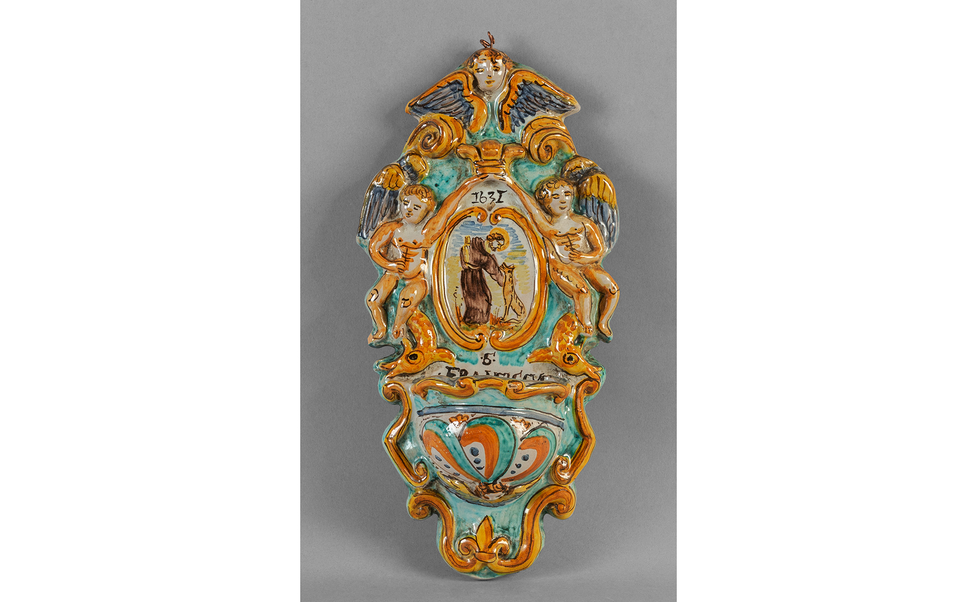 Acquasantiera in ceramica decorata in policromia con al centro raffigurazioni di San Francesco con il Bambino Italia Centrale sec.XIX