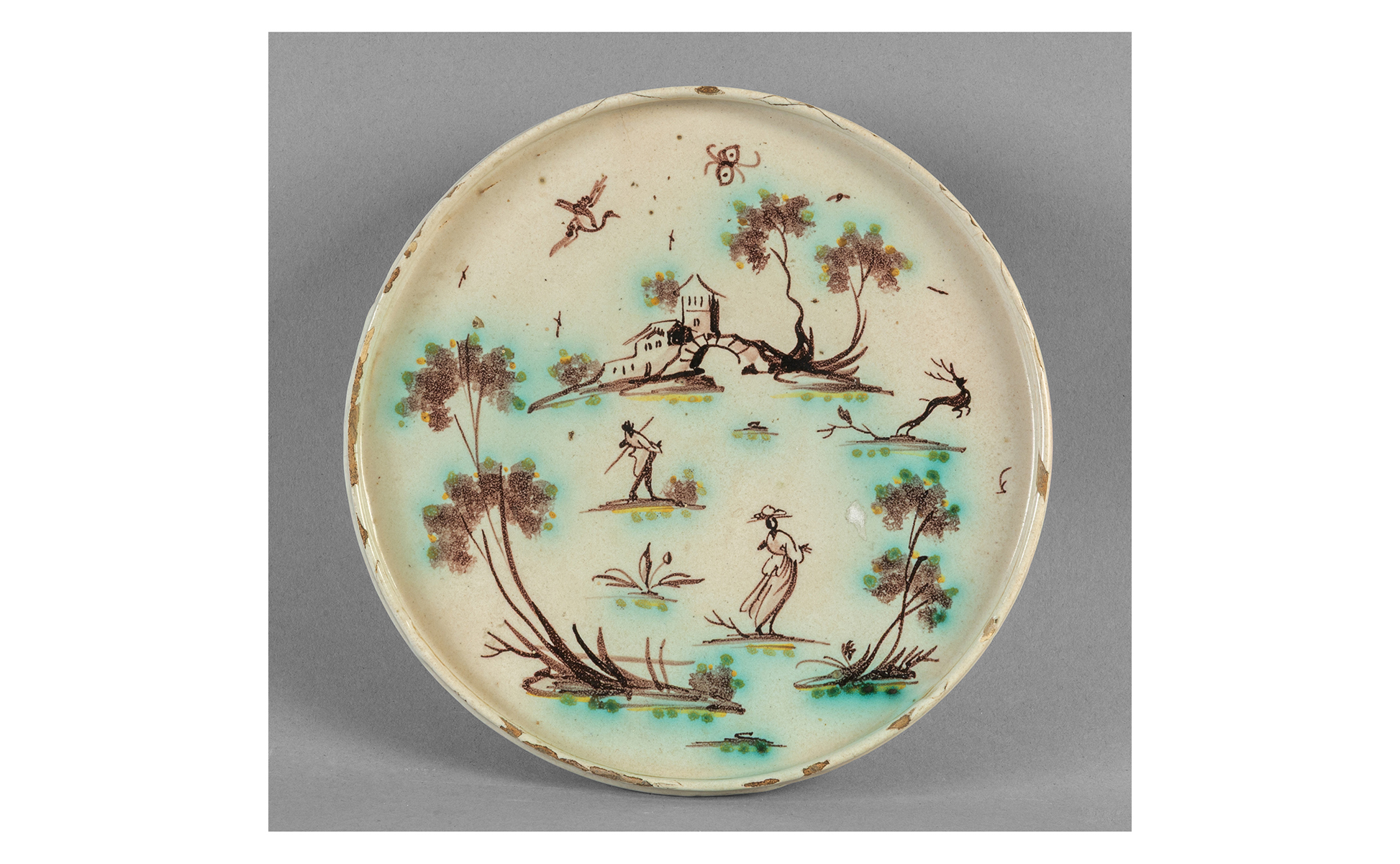 Alzata in ceramica decorata in policromia con figure su fondo bianco marca Lanterna Savona sec.XVIII