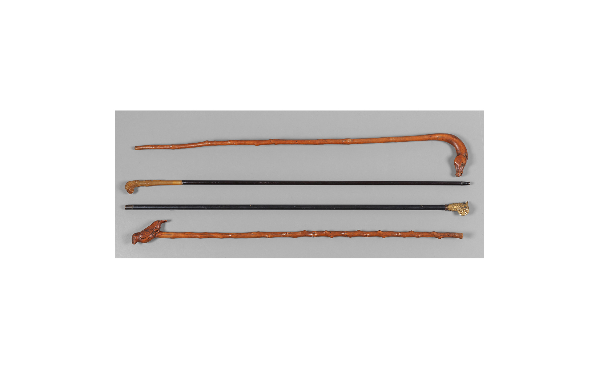 Due bastoni in bosso con manici a forma di animali e due bastoni con manici a forma di animali in corno e bronzo dorato