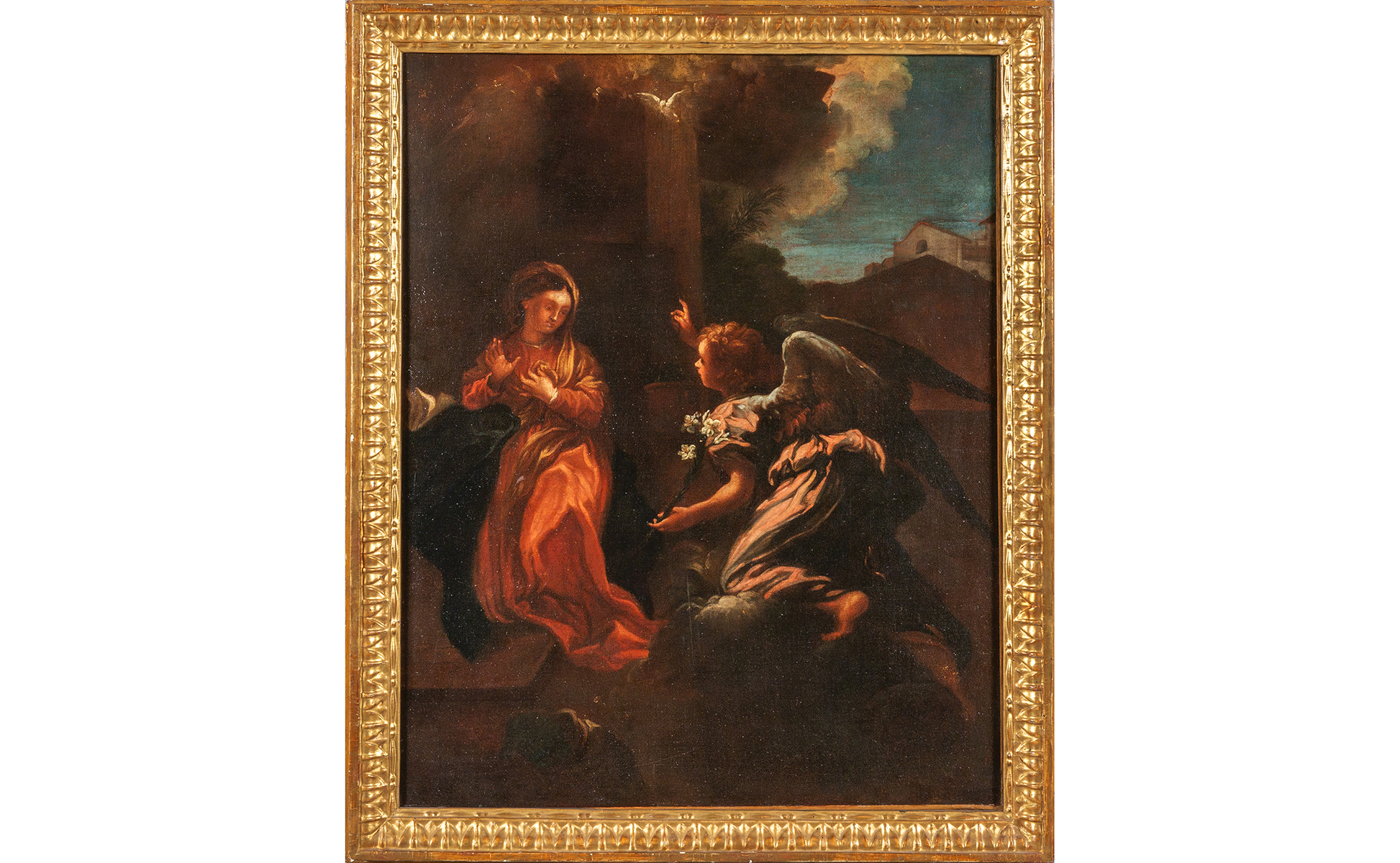 Scuola italiana sec.XVIII 'Annunciazione' olio sec.XVIII cornice in legno intagliato e dorato