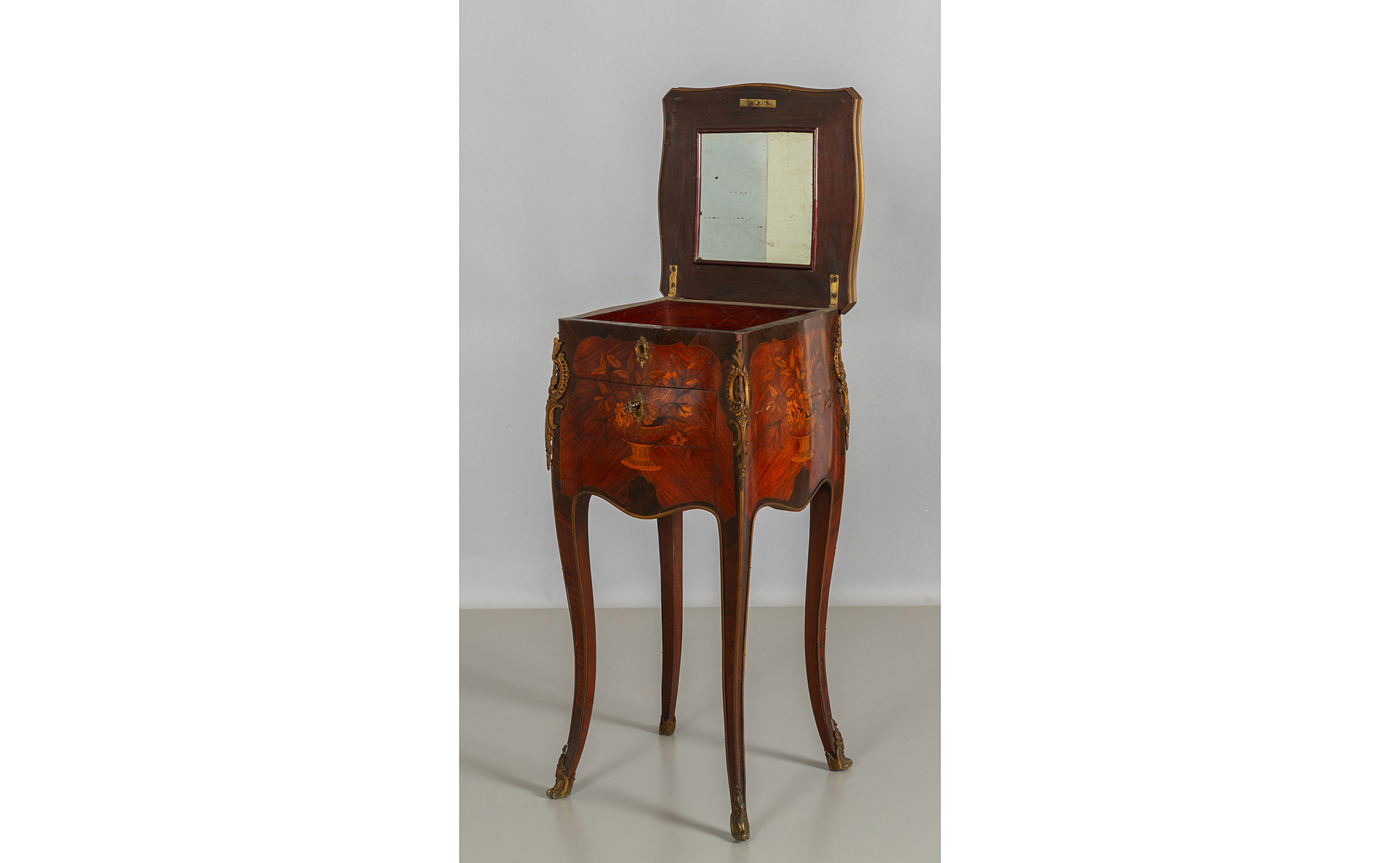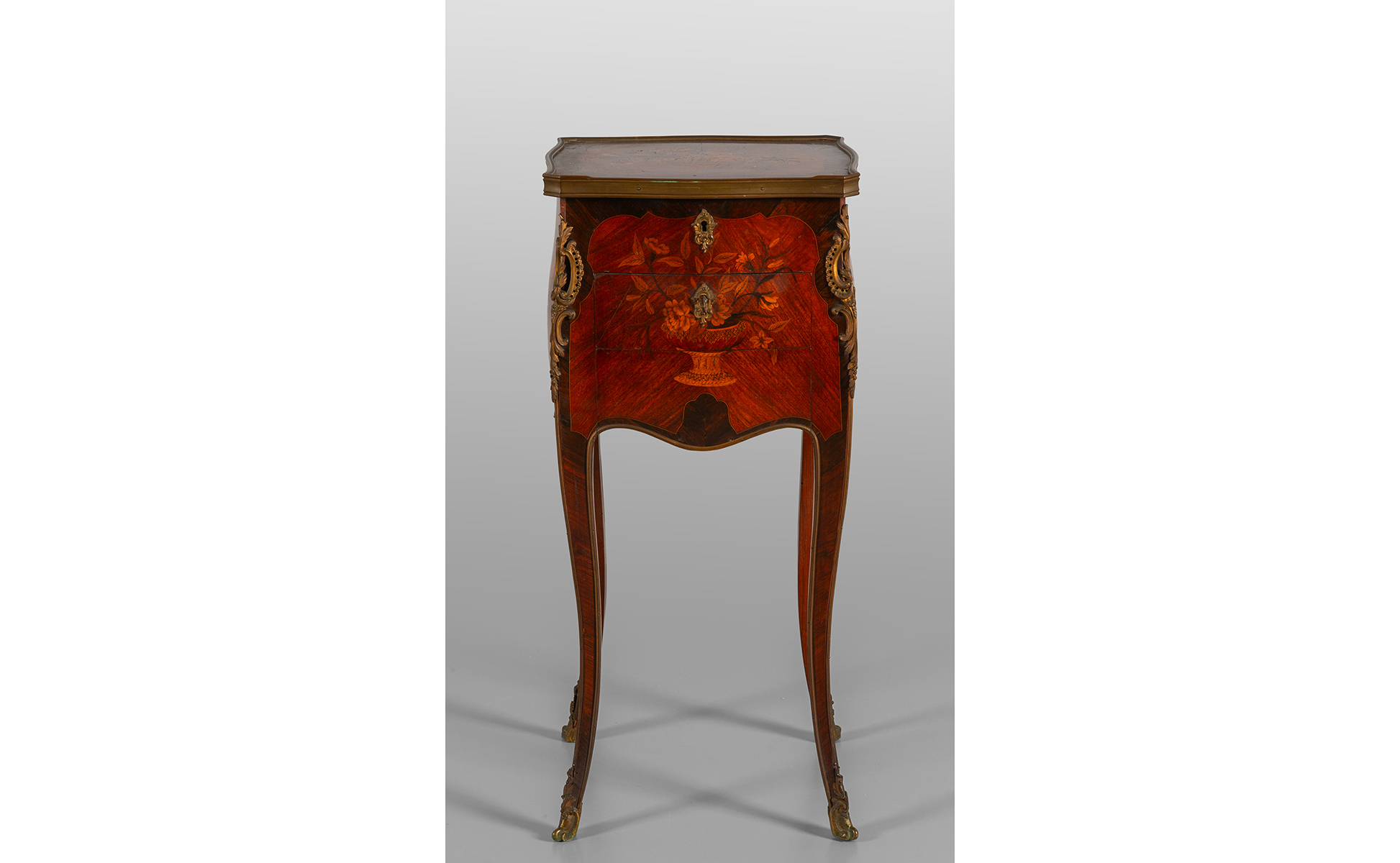 Comodino Napoleone III da centro lastronato e finemente intarsiato con vasi di fiori Francia fine sec.XIX