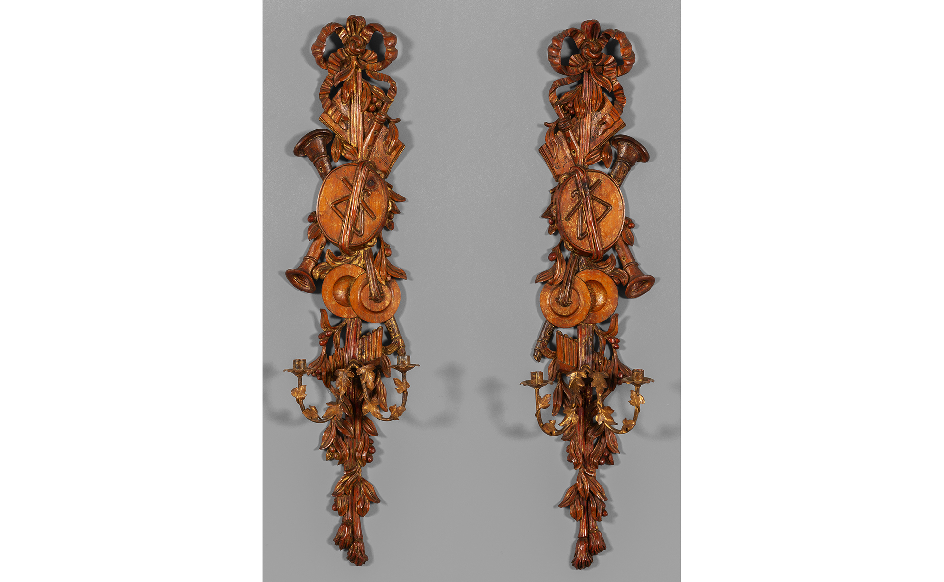 Coppia di apliques in legno intagliato a soggetti musicali sec.XX