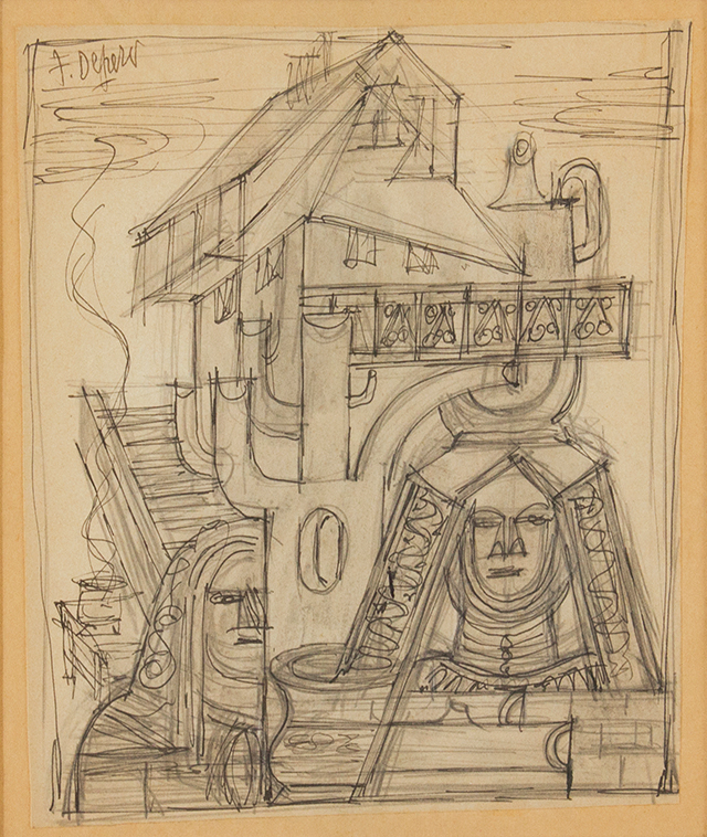 FORTUNATO DEPERO Fondo 1892 – Rovereto 1960 Rustico con due visi di donna, 1956 Disegno tinteggiato su carta, cm 22 x 26 Firma in alto a sinistra Autentica su foto Galleria Museo F. Depero, Rovereto, 16 Aprile 1973