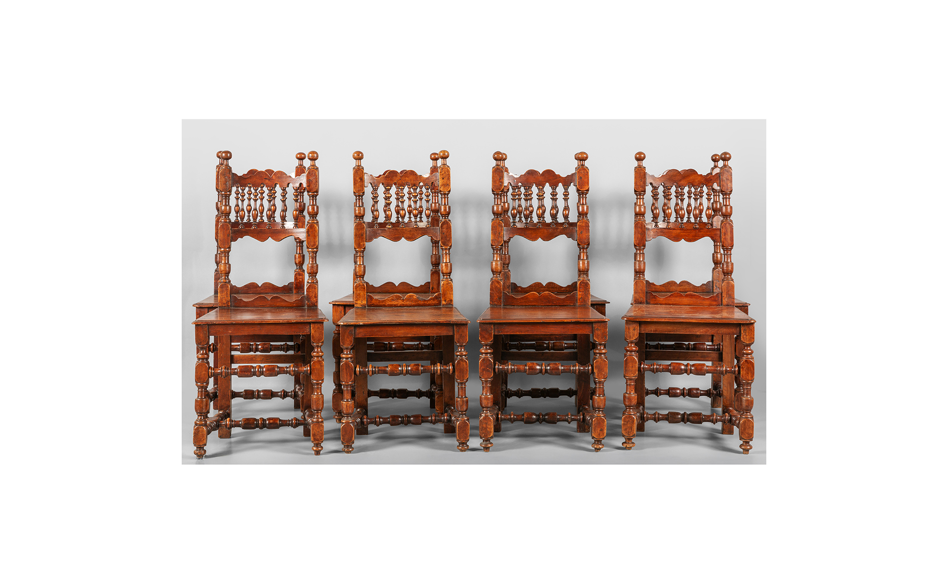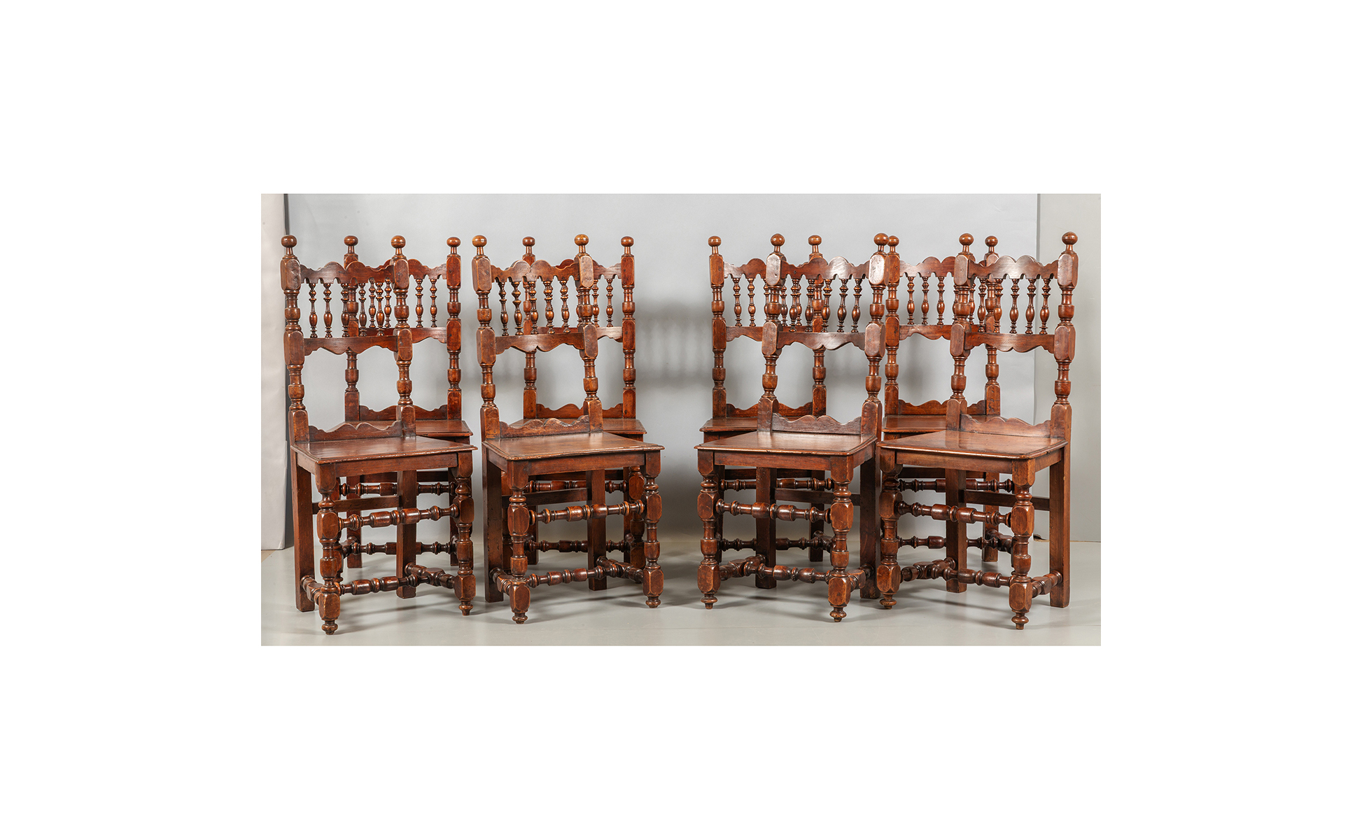 Precedente Lotto 0856 Successivo Aste Boetto - Via Mura dello Zerbino 10R, 16122 Genova ASTA DI ANTIQUARIATO Asta di Antiquariato mercoledì 18 giugno 2025 ore 15:00 (UTC +01:00) MOBILE Otto sedie in noce intagliate a birilli Toscana sec. XVIII