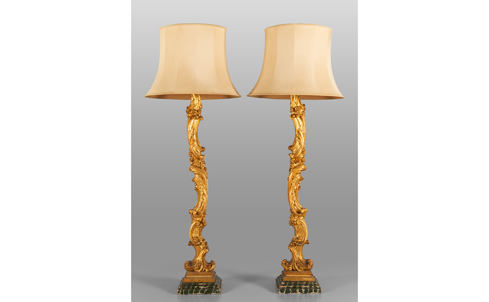 Coppia di piantane in legno finemente intagliato e dorato basi laccate a finto marmo sec.XVIII
