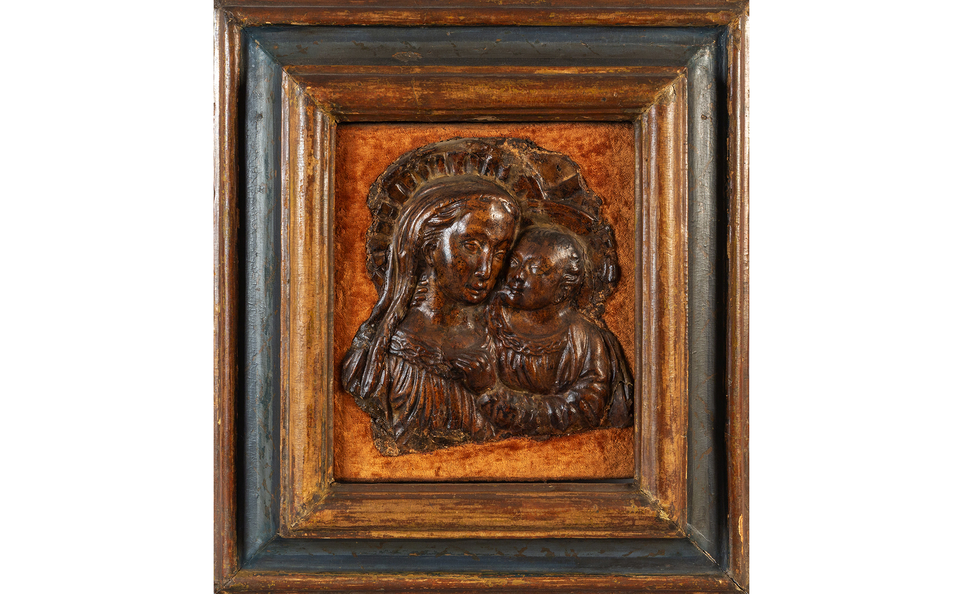 Madonna con Bambino bassorilievo in stucco cornice antica in legno intagliato e laccato sec.XVIII