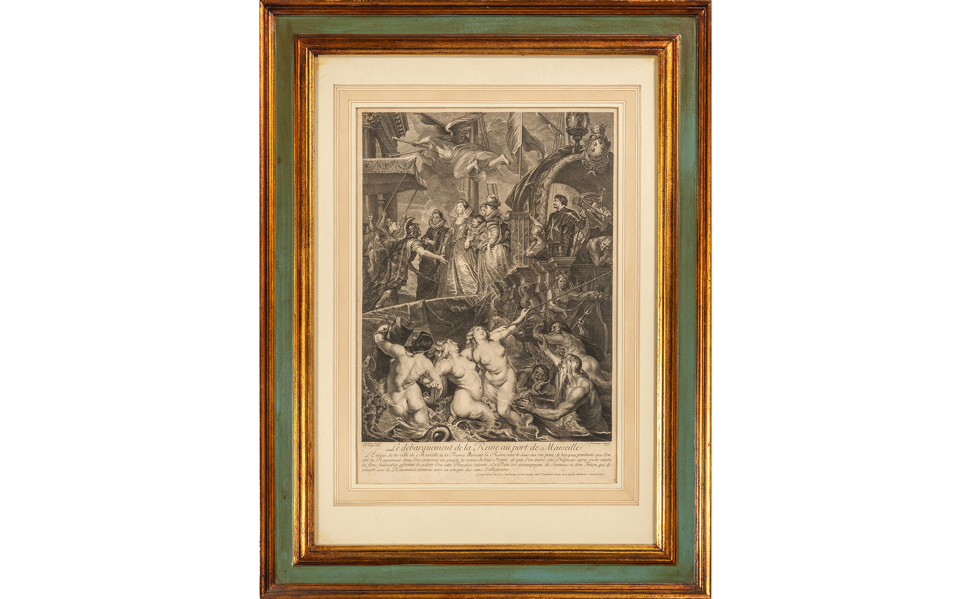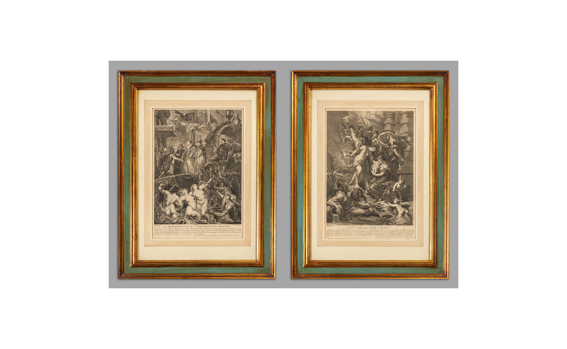 Lo sbarco della Regina nel porto di Marsiglia e la nascita della Regina coppia di stampe da Rubens G.Ducange sculpsit sec.XVIII