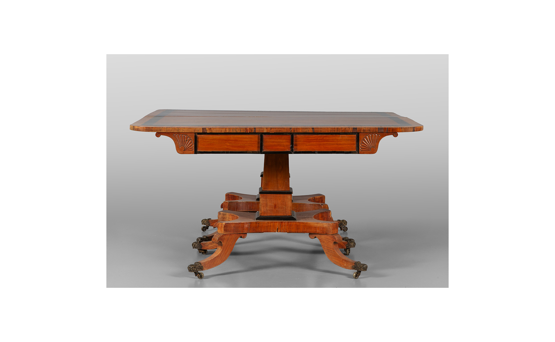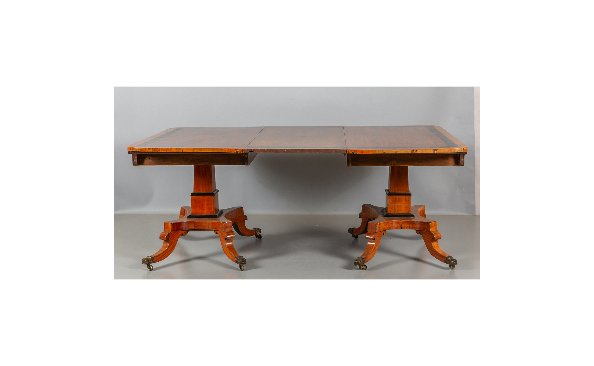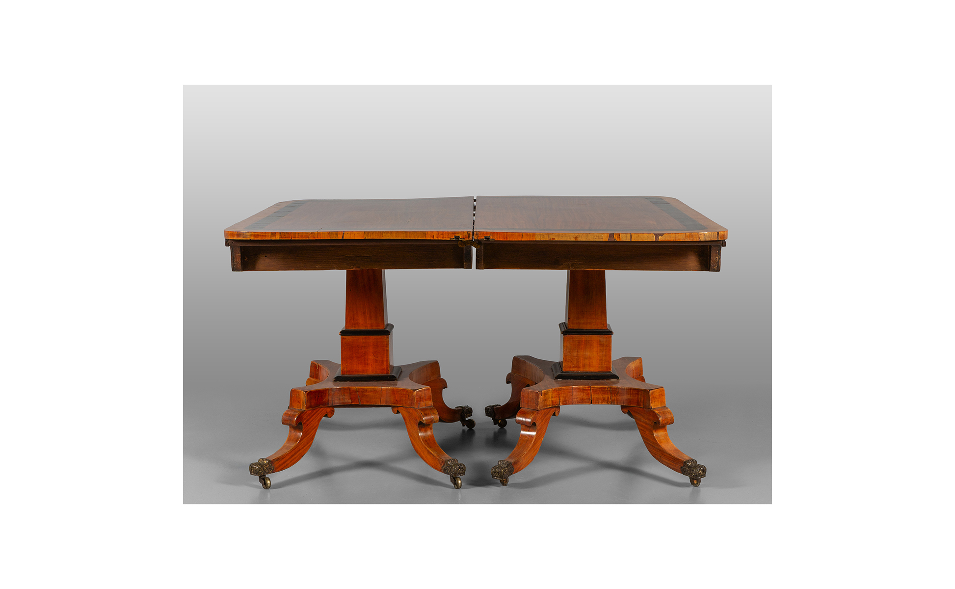 Tavolo composto da due mezzi tavoli impiallacciati in legno chiaro e legno ebanizzato Inghilterra I metà sec.XIX