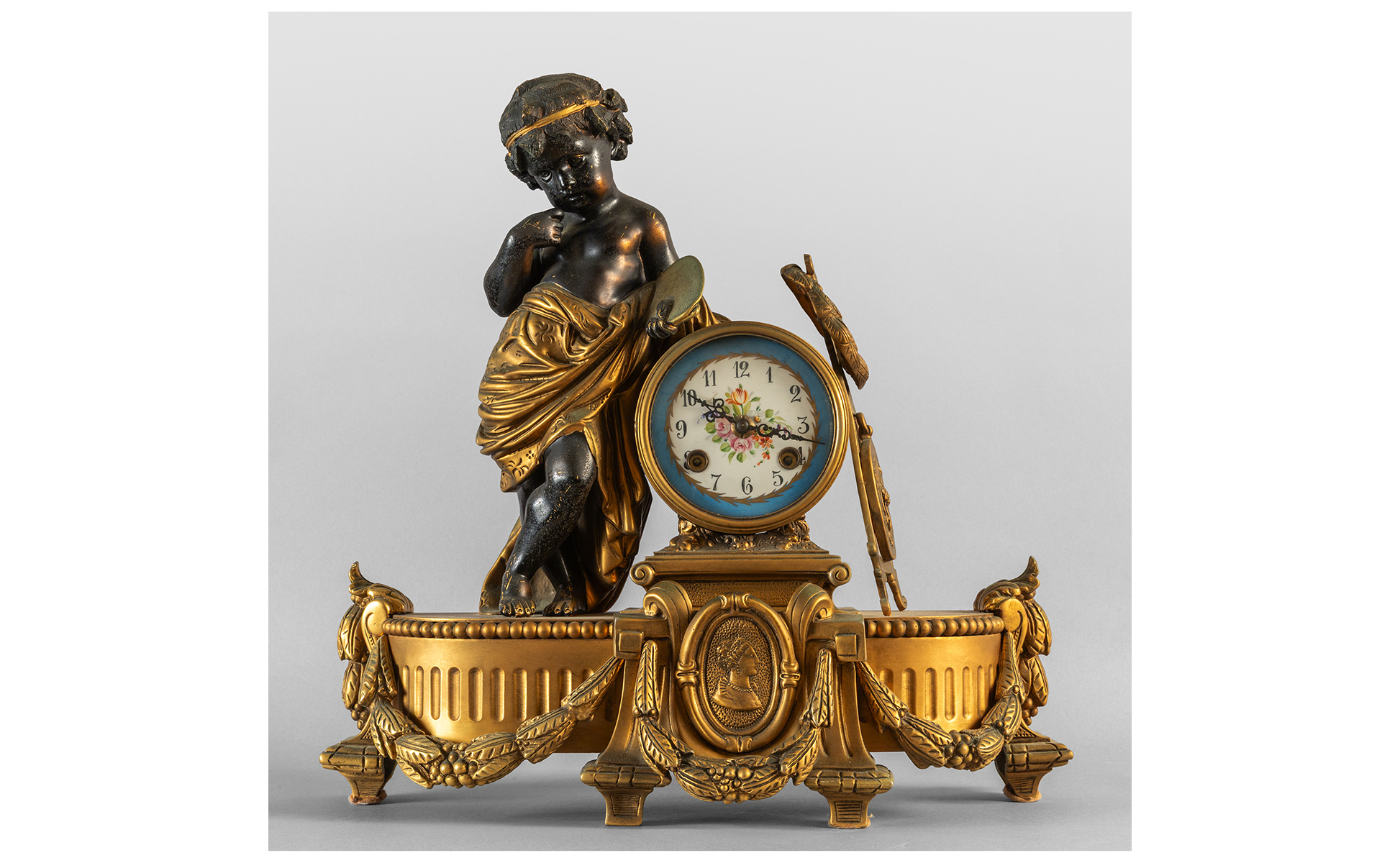 Orologio in bronzo dorato con putto quadrante in porcellana decorato con fiori in policromia Francia sec. XX