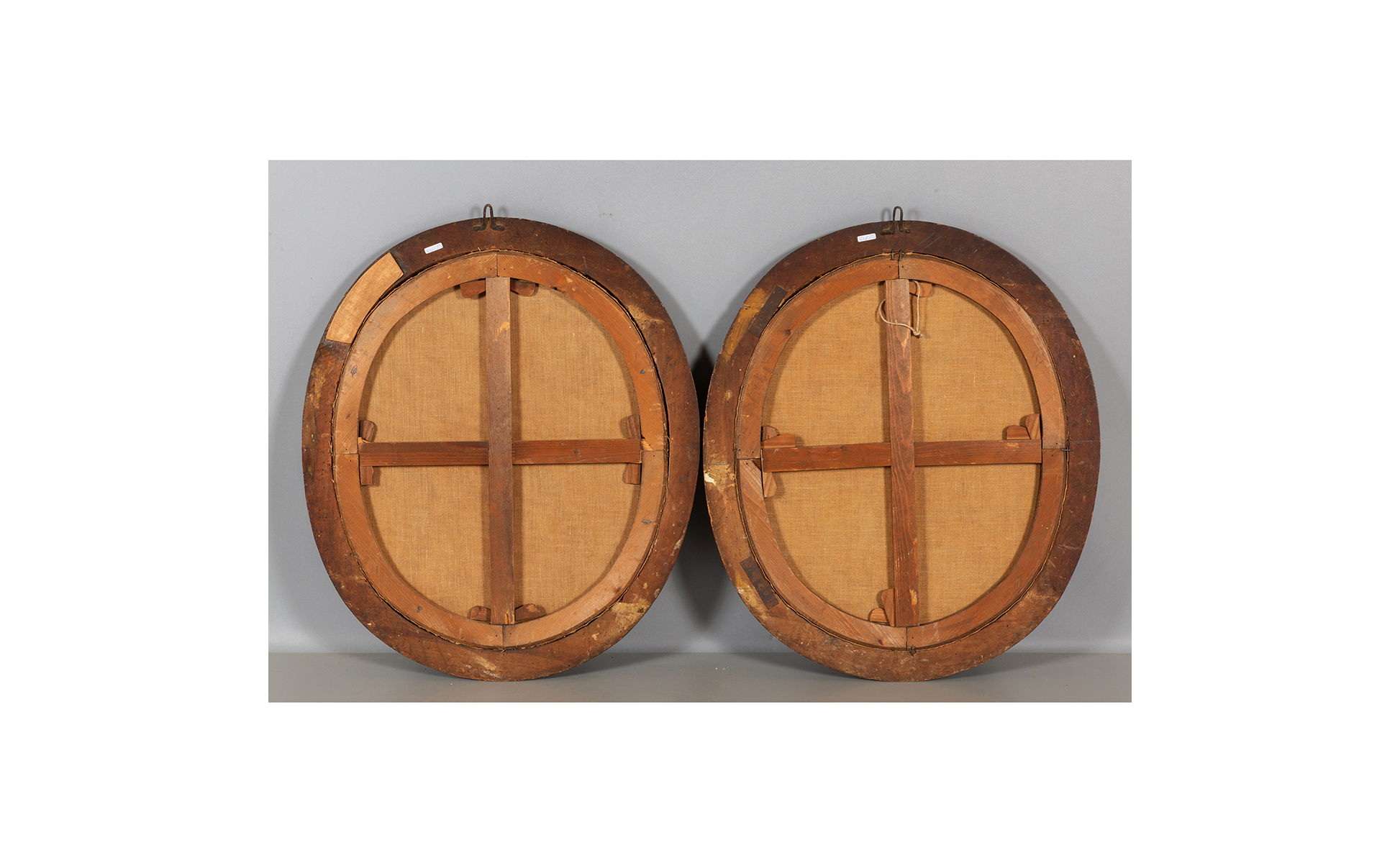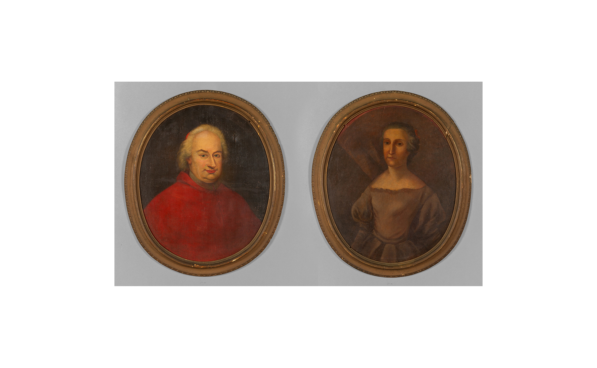 Scuola piemontese sec.XVIII 'Vescovo' e 'Gentildonna' coppia di olii di forma ovale cornici coeve in legno intagliato e dorato