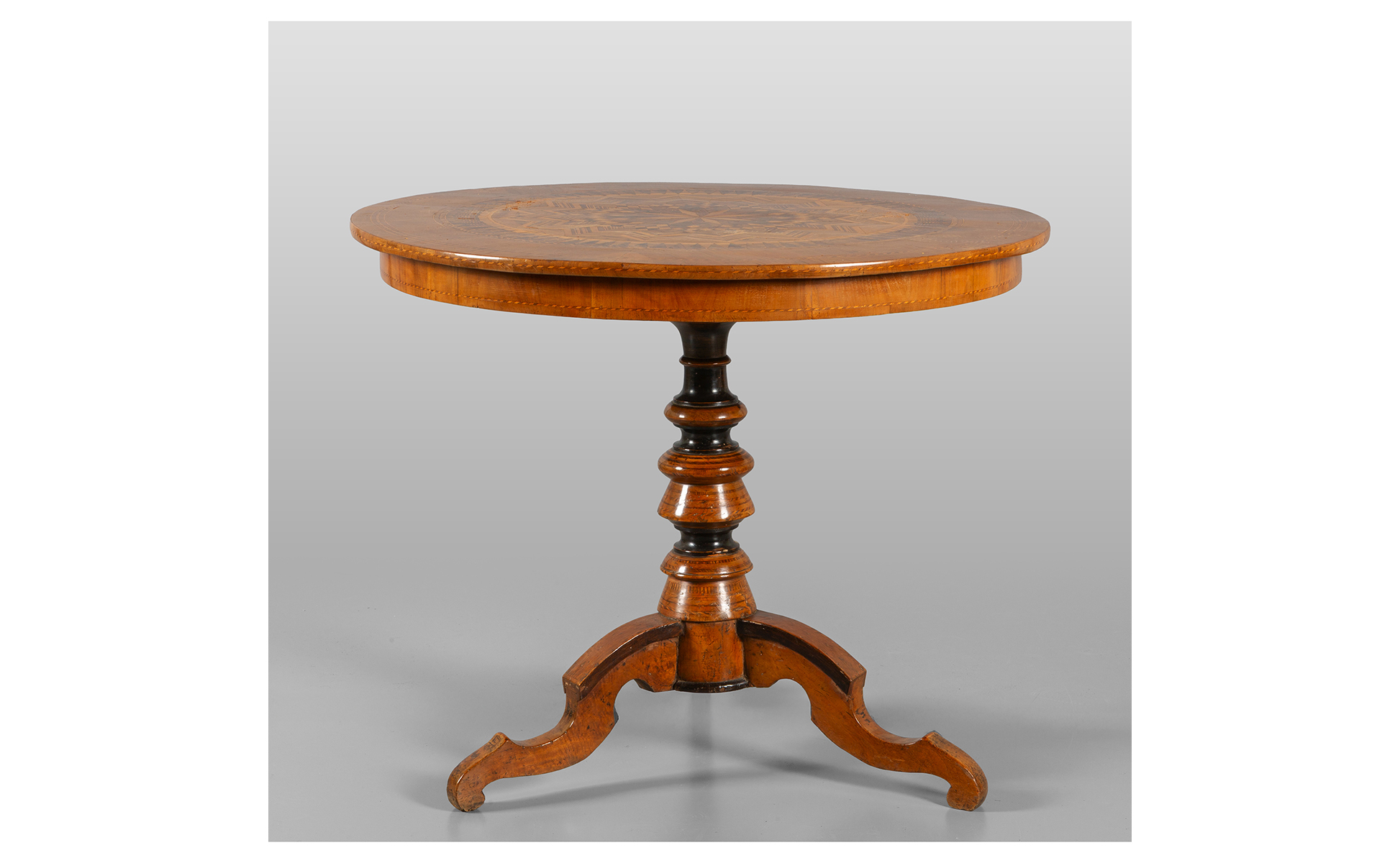 Tavolino da centro di forma rotonda intarsiato Rolo sec.XIX