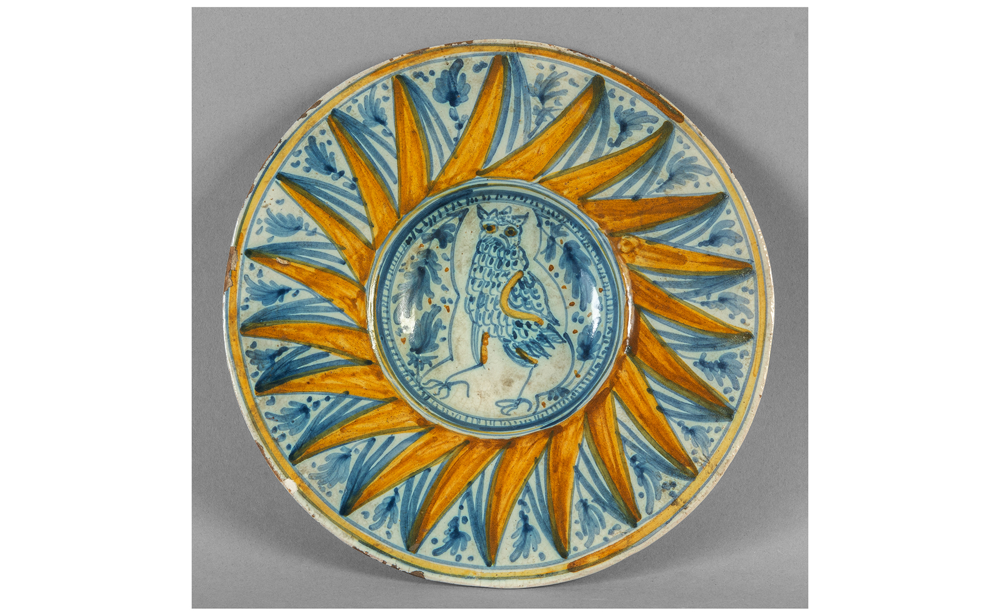 Piatto in ceramica decorazione in policromia nel cavetto un gufo Italia centrale sec.XIX
