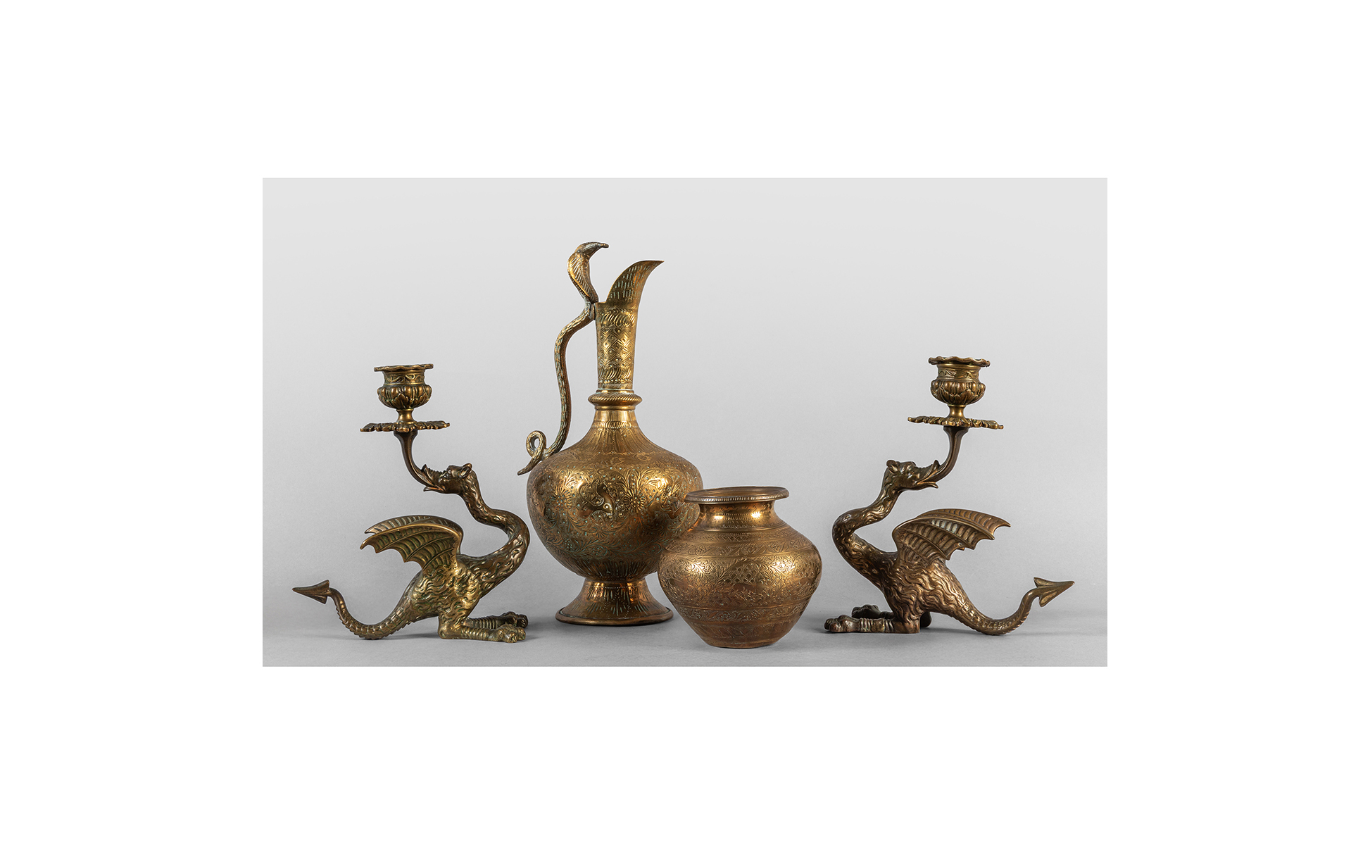 Coppia di candelieri in metallo a forma di dragone (h.cm.20) brocca in metallo (h.cm.29) e vasetto in metallo (diam.cm.11 5x10 difetti)