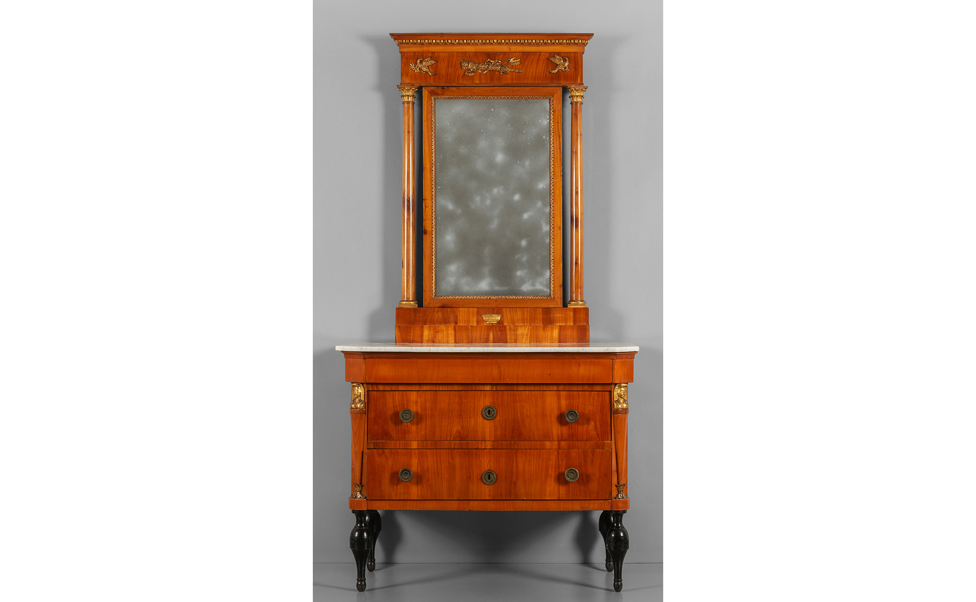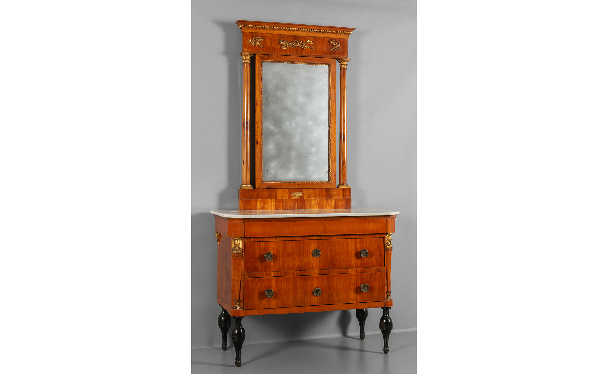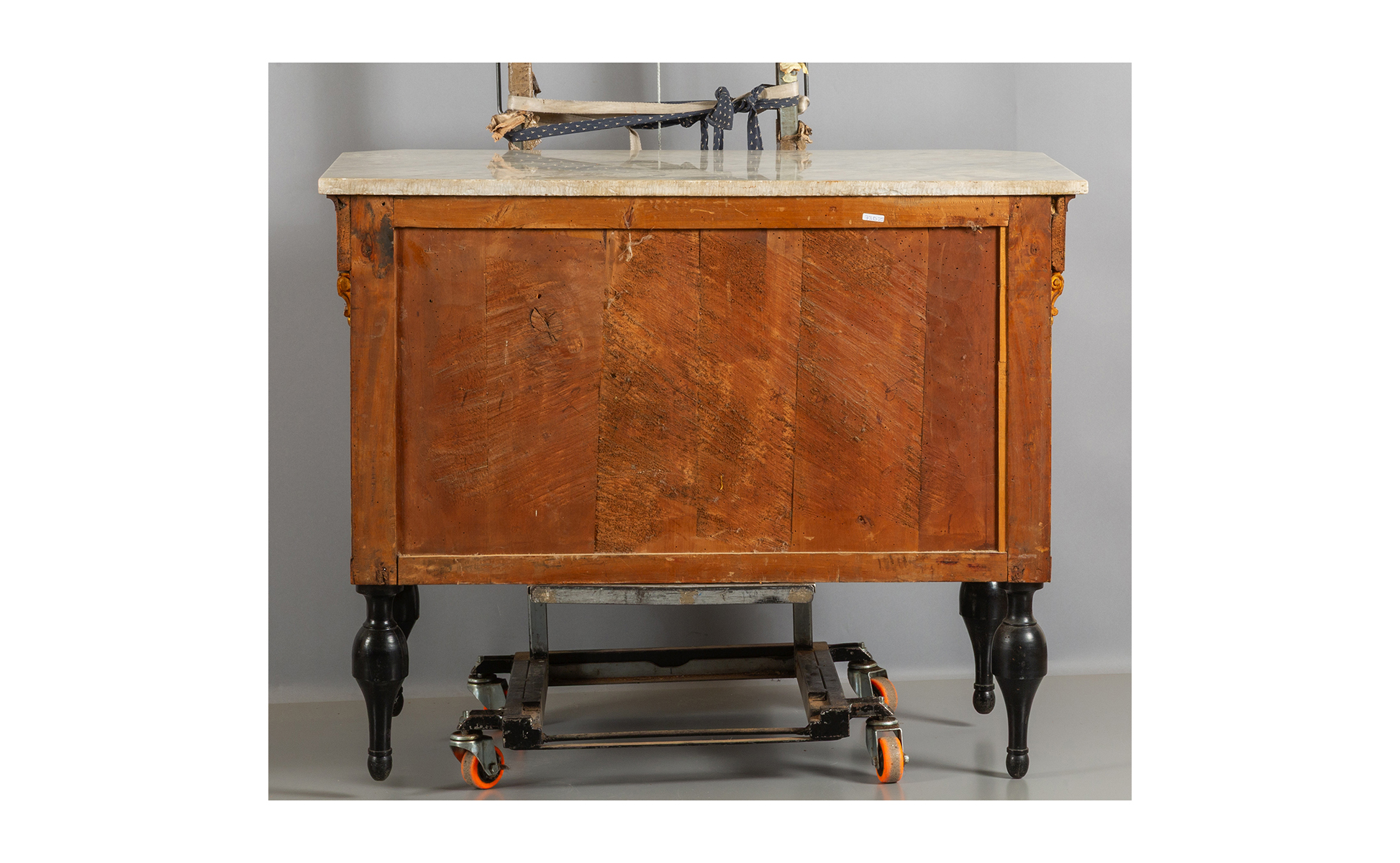 Comò retour d'Egypte lastronato in ciliegio montanti in legno intagliato e dorato con sfingi due più uno cassetti nella fascia piano in marmo con specchiera analoga Lucca sec.XIX