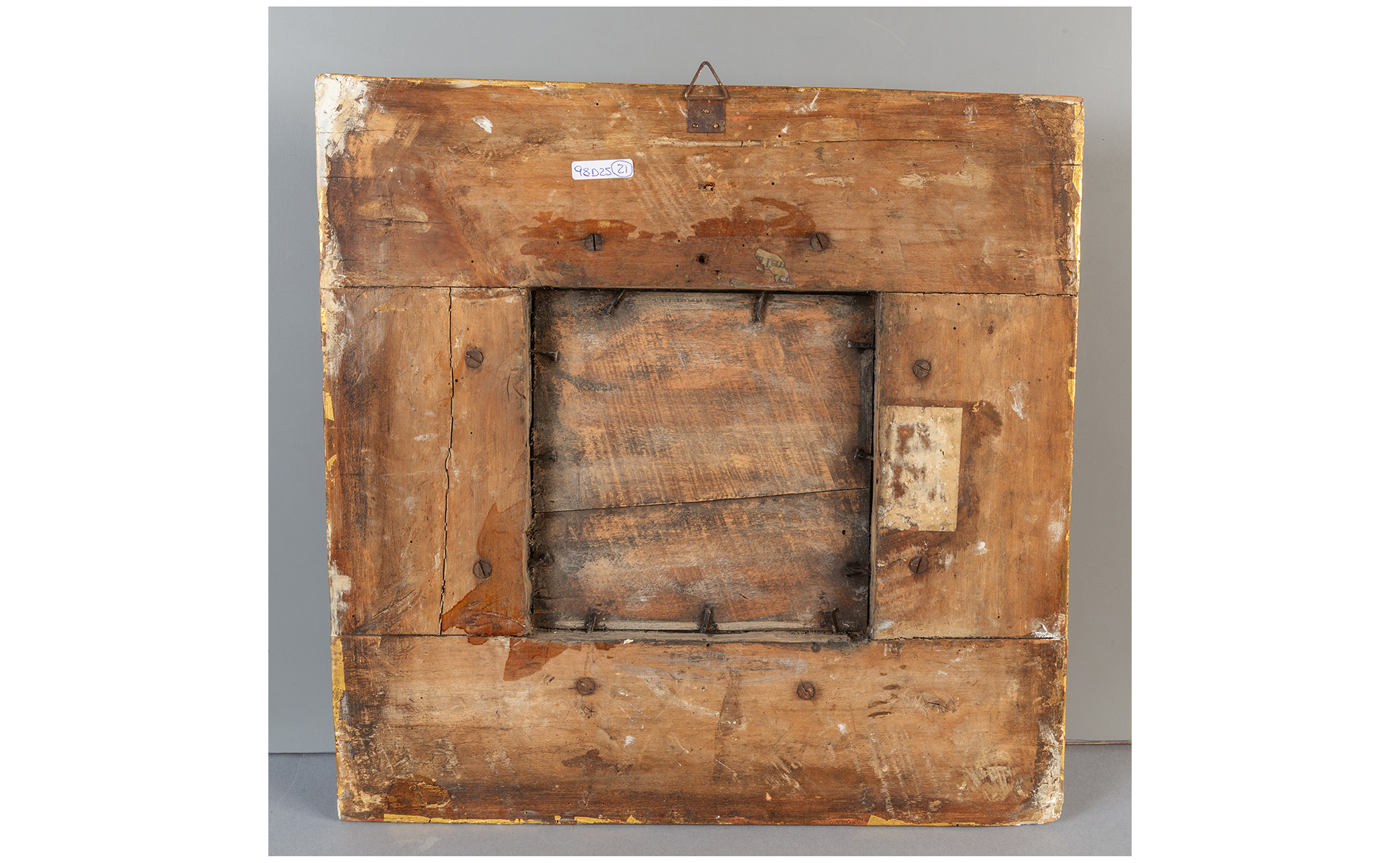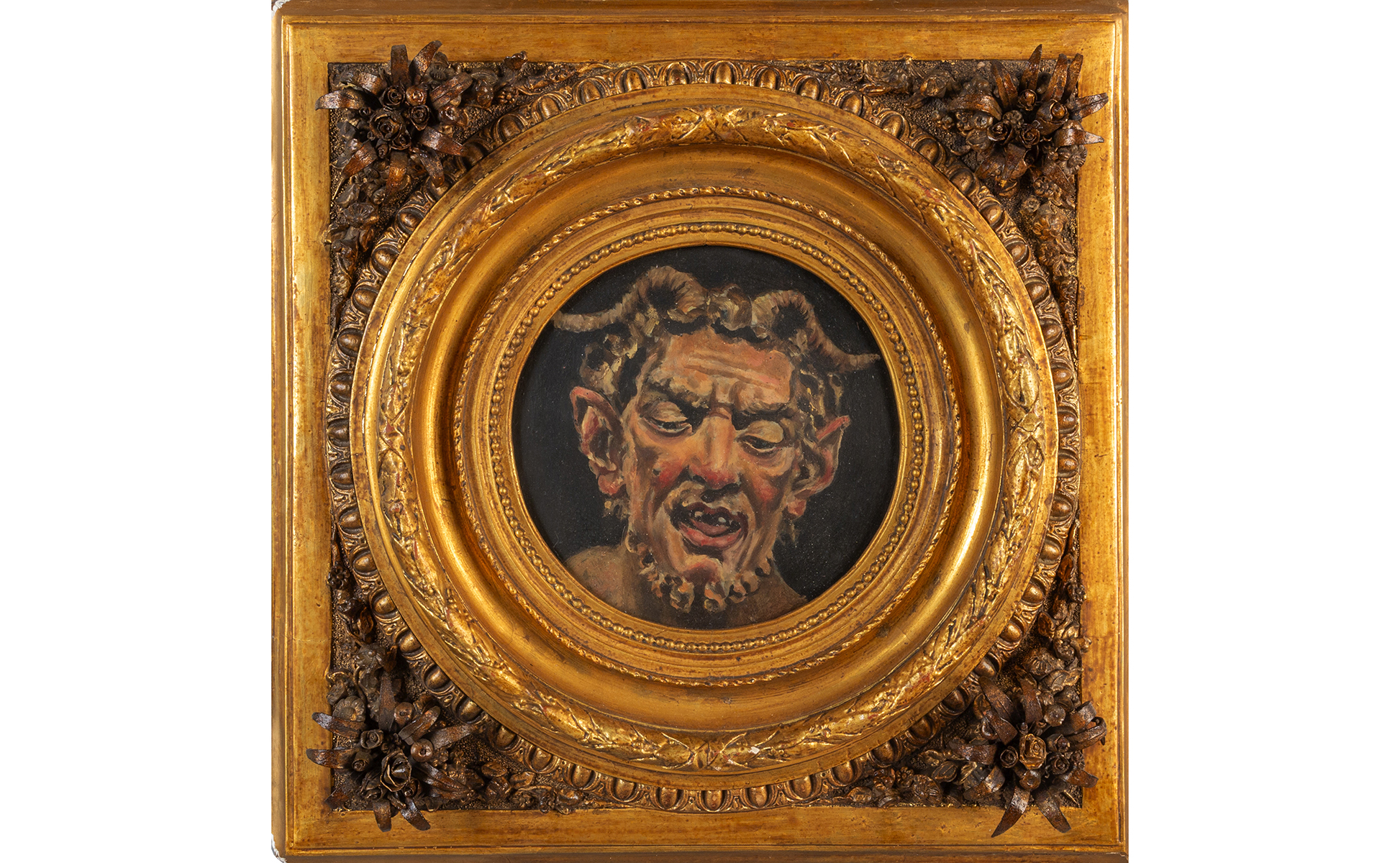 'Diavolo' olio su rame cornice dorato con decorazioni di fiori in rilievo in ferro dorato