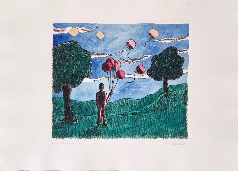 SCHULER MARCO Germania 1972 "Soli" Incisione su cartoncino colorata a mano cm 70x50. Intitolata e firmata sul fronte in basso a destra, tiratura 25/100 e dicitura "colorata a mano" a sinistra.
