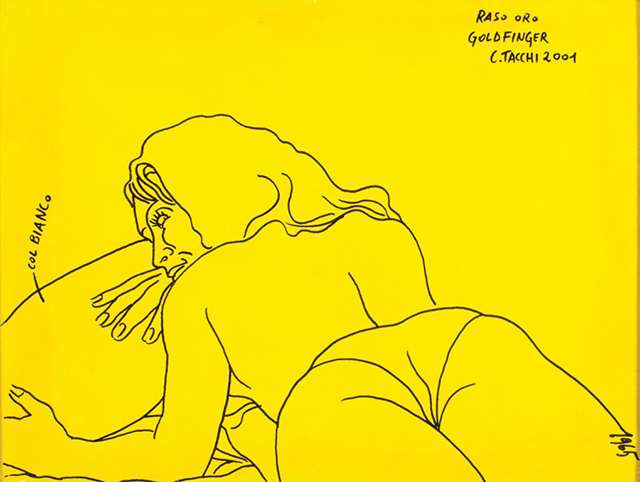 CESARE TACCHI Roma 1940 - 2014 Gold finger, 1965 - 2001 Pennarello nero su cartoncino giallo, cm 50 x 70 Data in basso a destra Firma, data e titolo in alto a destra Studio per opera in tessuto con data 2001 in alto a destra