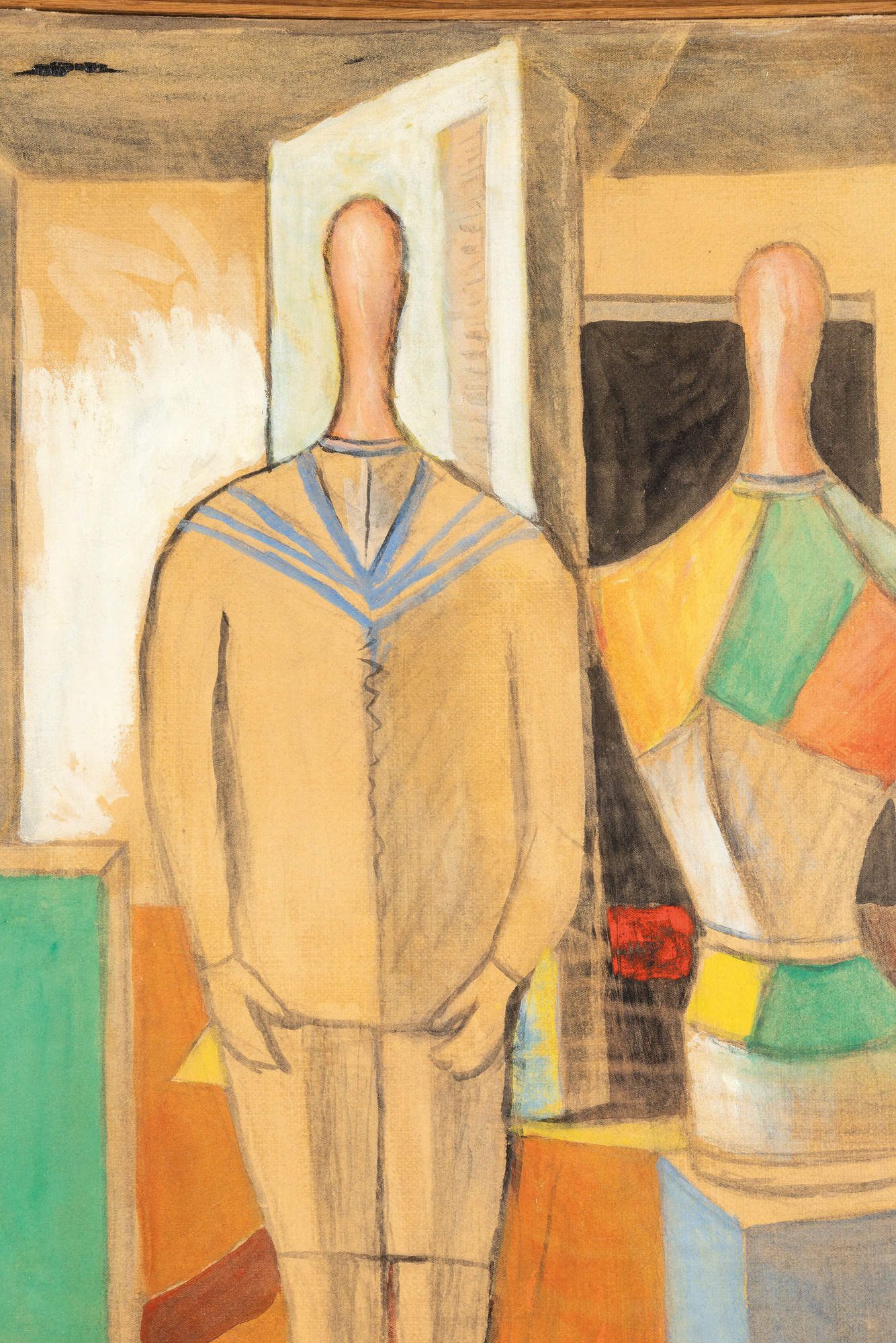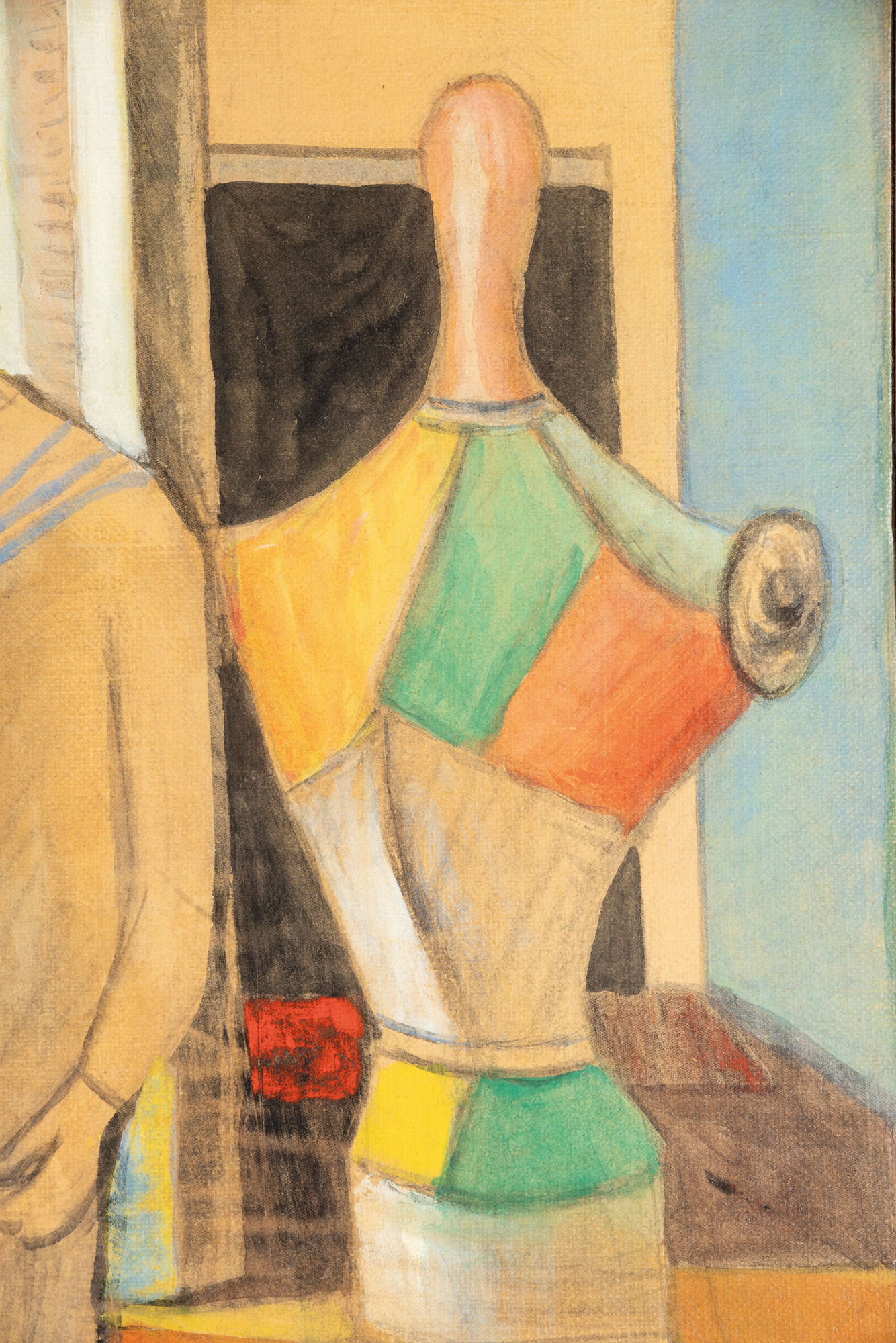 In Madre e figlio , Carrà non rappresenta una scena realistica o narrativa, ma una composizione immobile e sospesa, dominata da due figure simili a manichini o statue, poste allinterno di uno spazio architettonico chiuso, quasi teatrale.