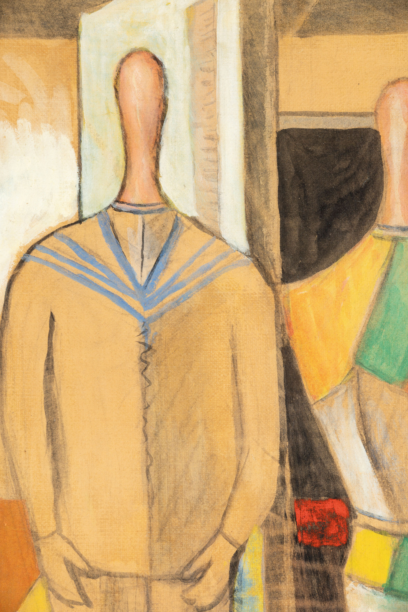La madre appare monumentale, con tratti geometrici e inespressivi, simile a una scultura o a un idolo arcaico. Il figlio è una figura più piccola, anchegli ridotto a una forma stilizzata e muta, quasi un simulacro. Lo sfondo architettonico contribuisce alla sensazione di immobilità e di estraneità. La luce fredda e uniforme abolisce ogni effetto atmosferico o emotivo: tutto è fermo, silenzioso, atemporale.