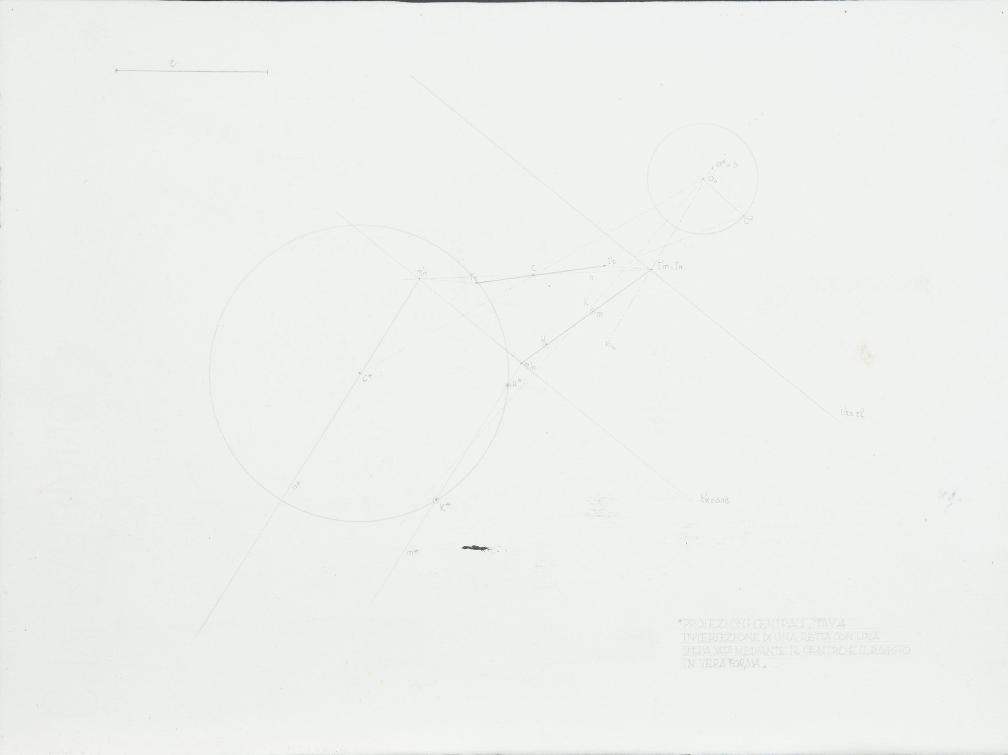 Proiezioni centrali/tav4.Intersezione di una retta con una sfera data mediante il centro e il raggio in vera forma, 1950