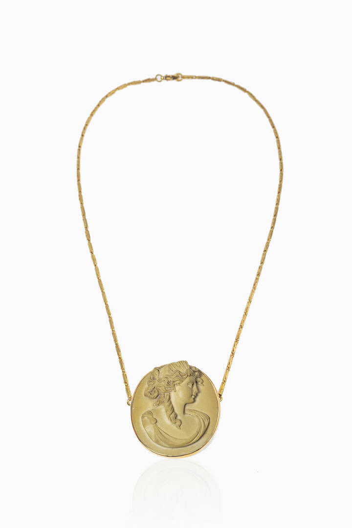 in oro giallo con ciondolo in pietra lavica di forma ovale con figura femminile incisa.