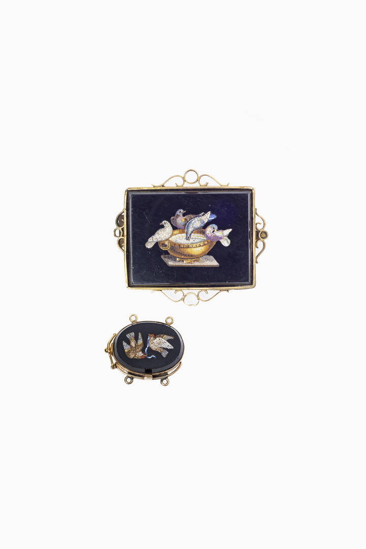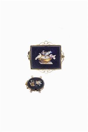 -spilla di forma rettangolare in pastreavitrea, su base di colore nero; raffigurante micromosaico con colombe. Cm 4x4,5