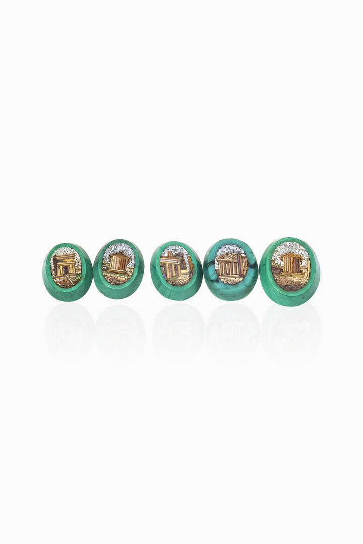 di forma ovale, a scalare, su base in pasta vitrea verde, raffiguranti monumenti romani.